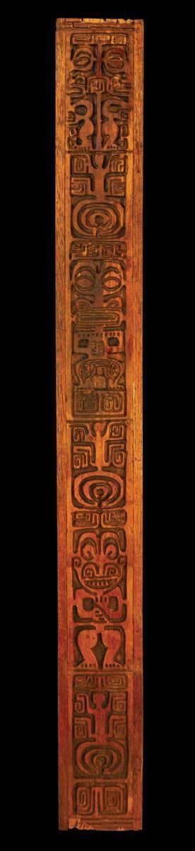 (1960s) A very rare master pattern for intricate Marquesan pattern wall trim. These would be used for doorway and cabinet accents in commercial Polynesian restaurants and bars. Double-sided and carved in hardwood.33"x3"VG+ with wear