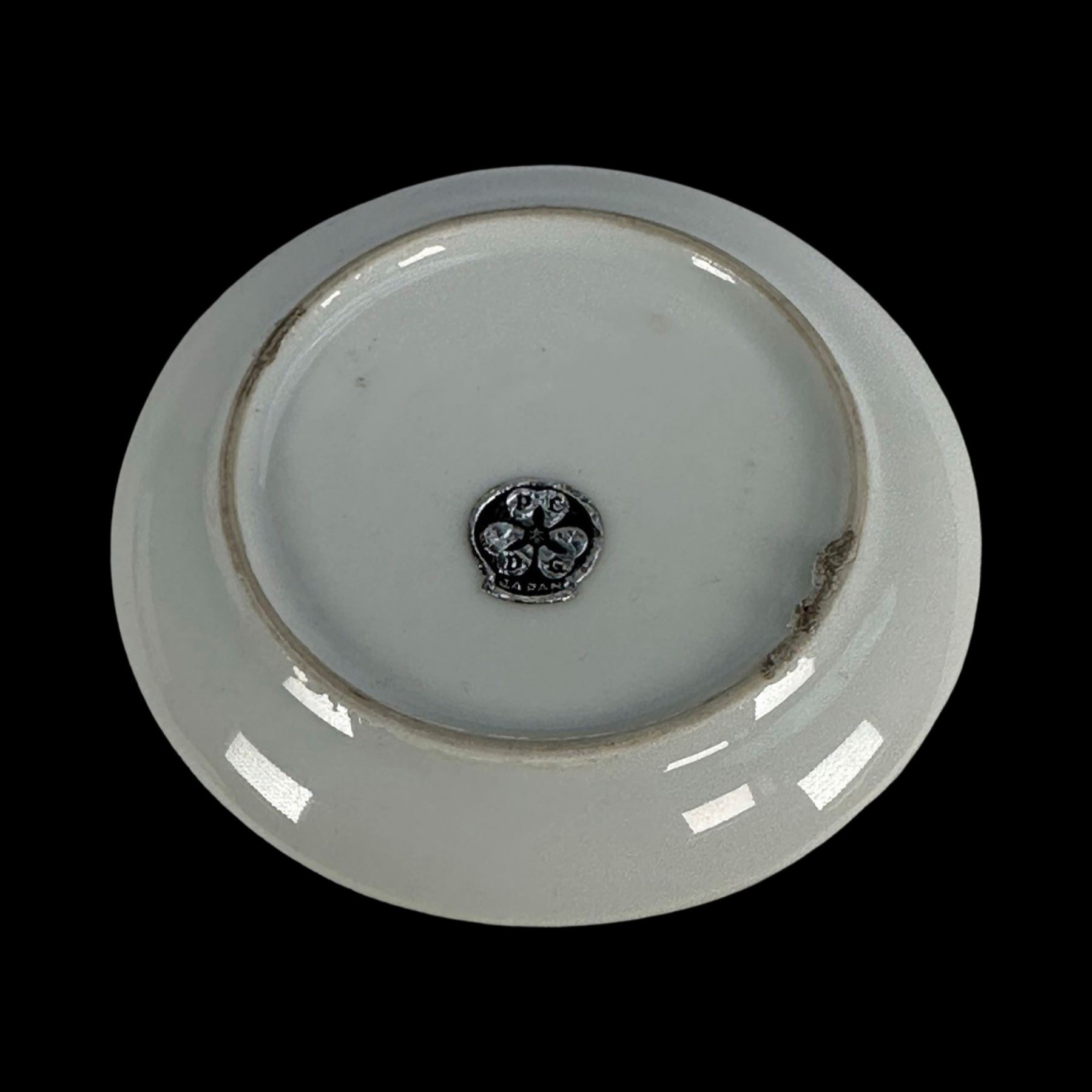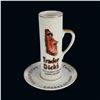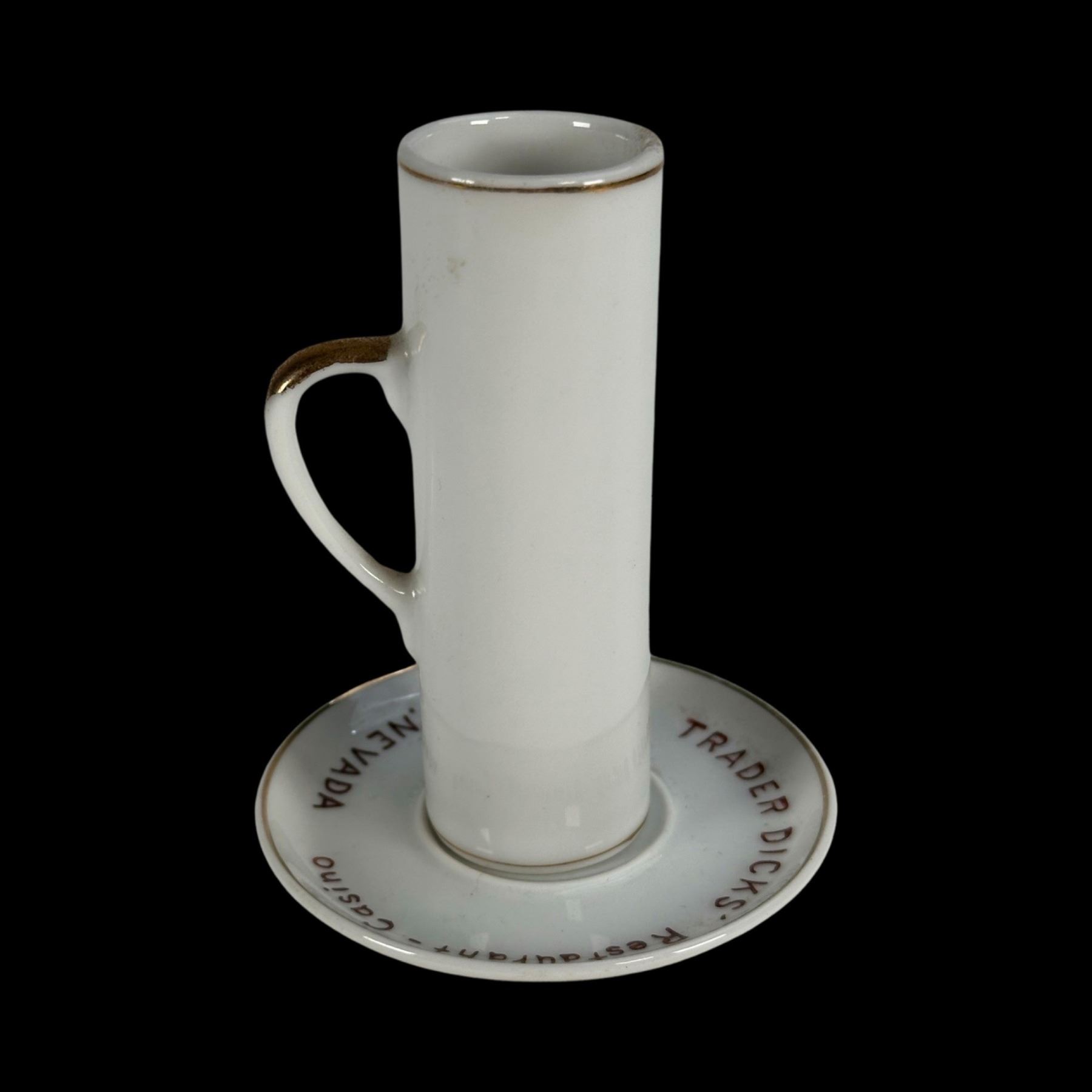 (1960s)* Museum piece displayed at the Catalina Museum Tall Tiki Tales exhibition. VG+. 2"x4"x1.25" cup, 3.25"dia saucer.