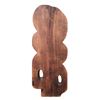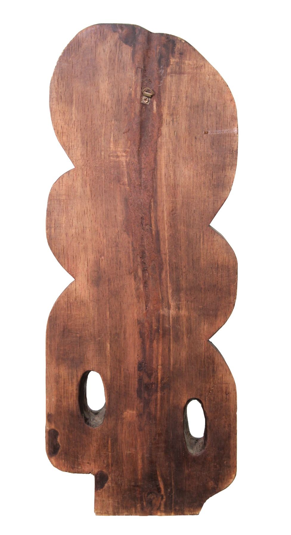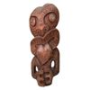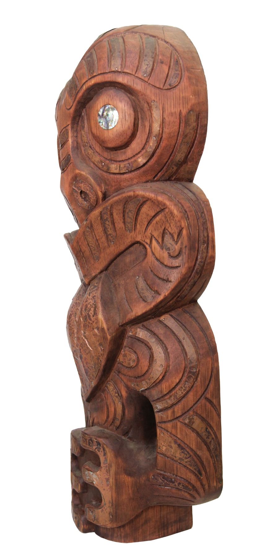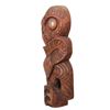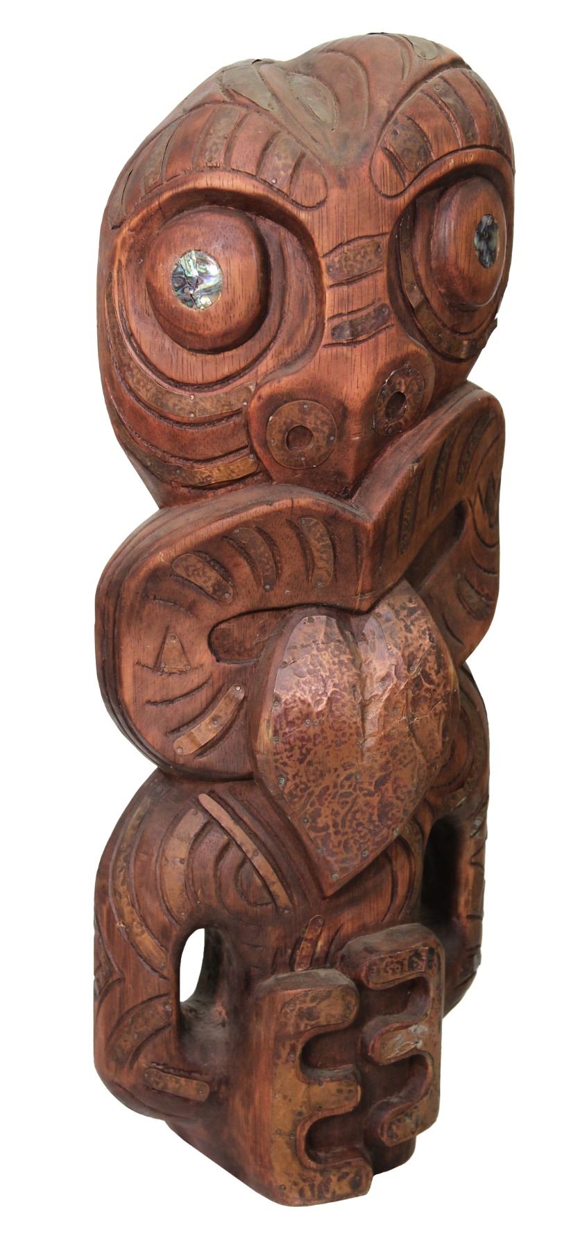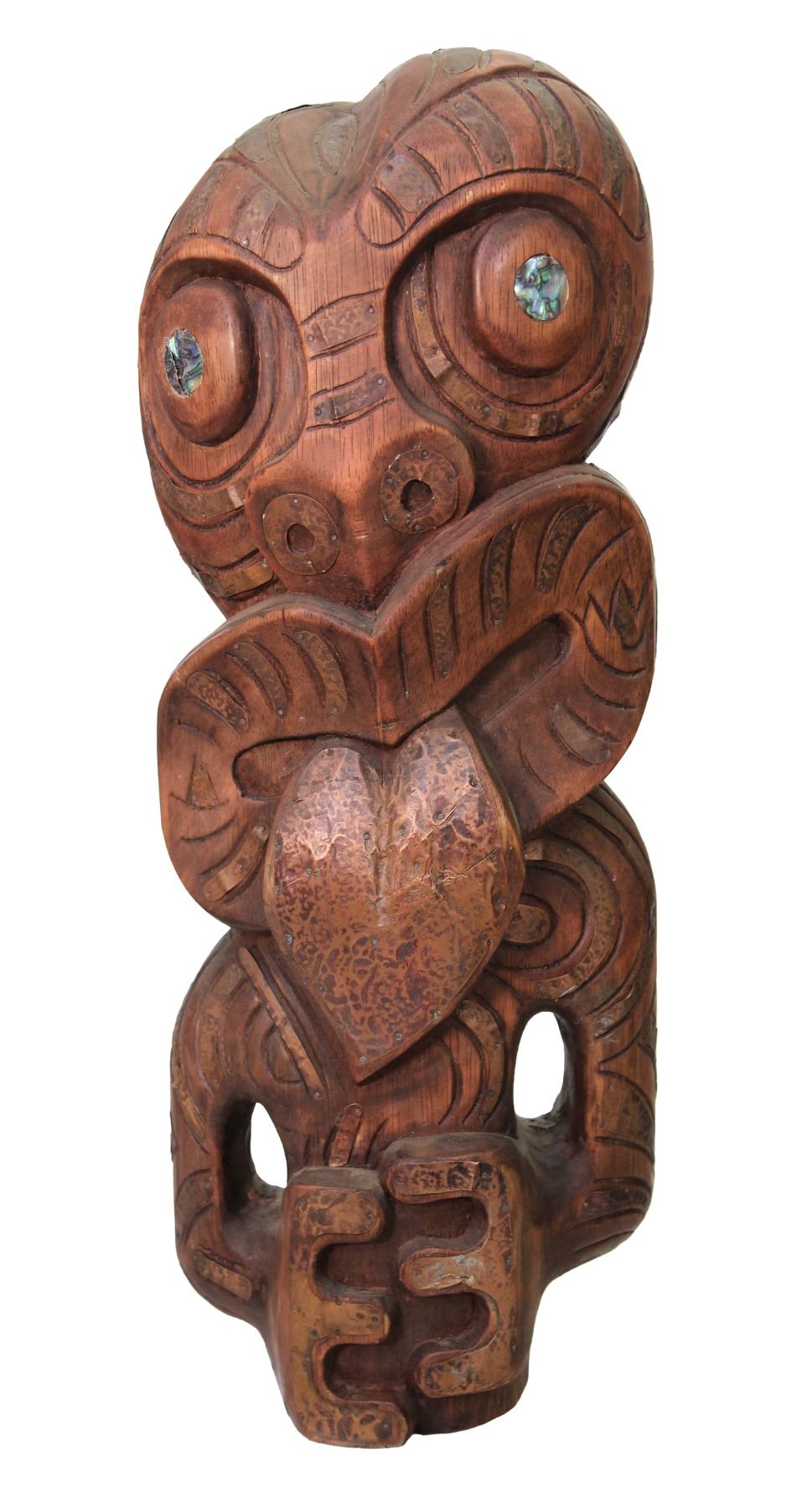 (2000s) Hand carved Maori-style Tiki idol features inlaid, cut copper on tongue, arms, and other areas with mother-of-pearl shell eyes. From THE SVEN KIRSTEN KOLLECTION.Solid wood. 23.5"x9.25". VG+.