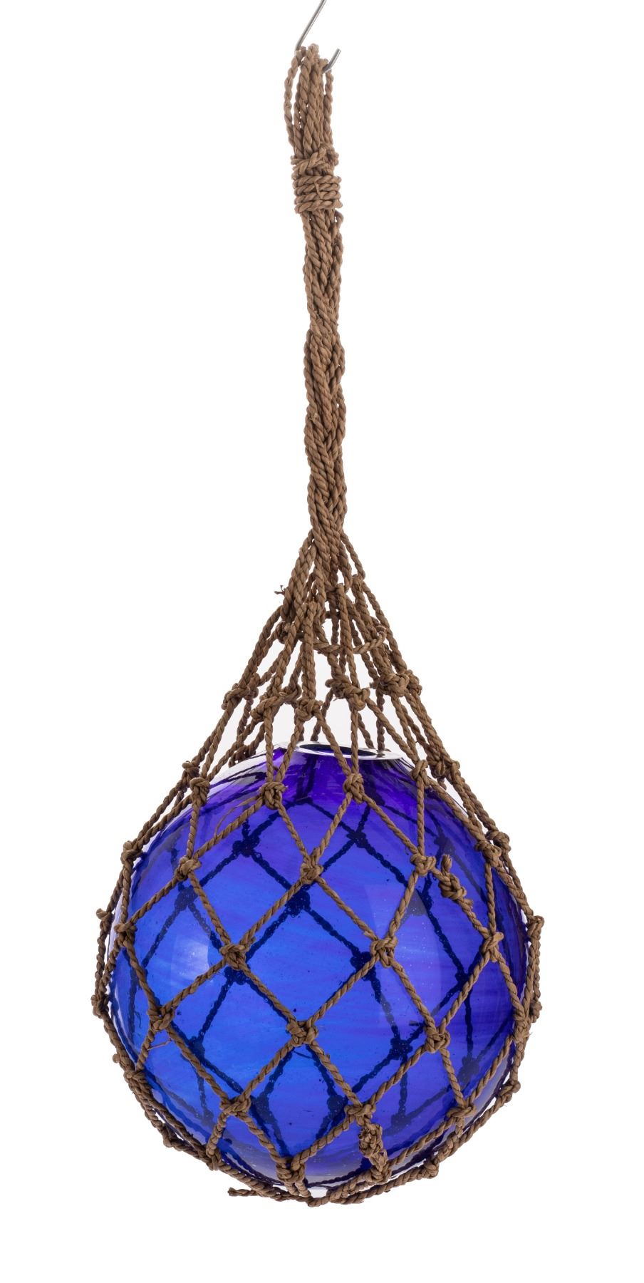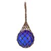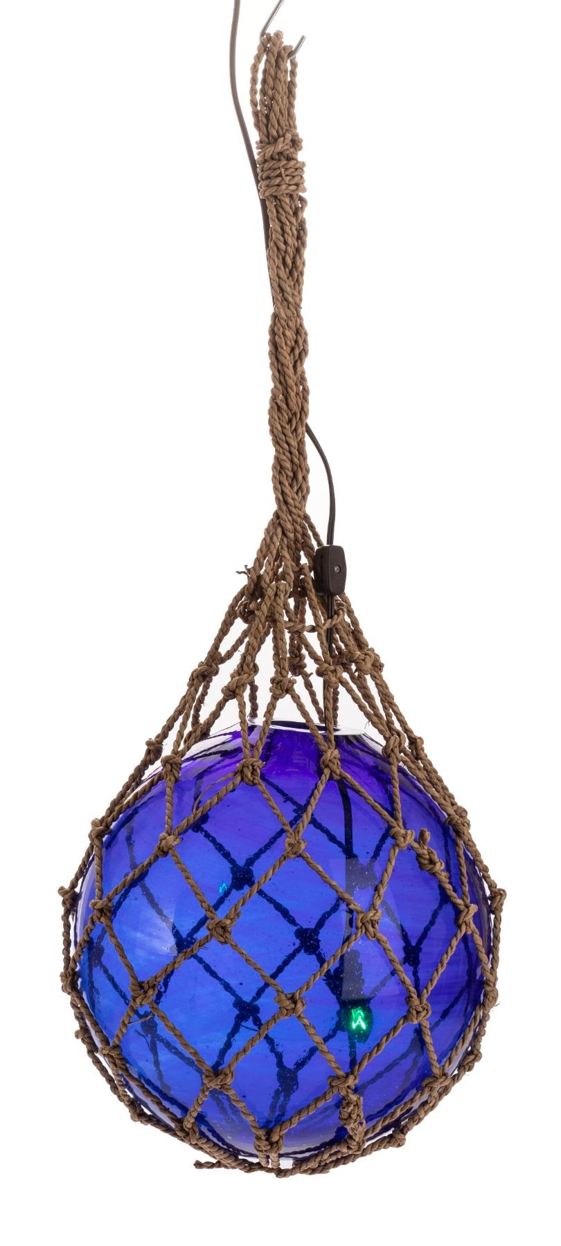 (1970s) A now rare, Oceanic Arts cobalt blue hued glass hanging fishing float with rope netting comes with electric cord. This is the older type with thick, hand blown glass. The cornerstone of any true Tiki bar! 12" dia. VG+.