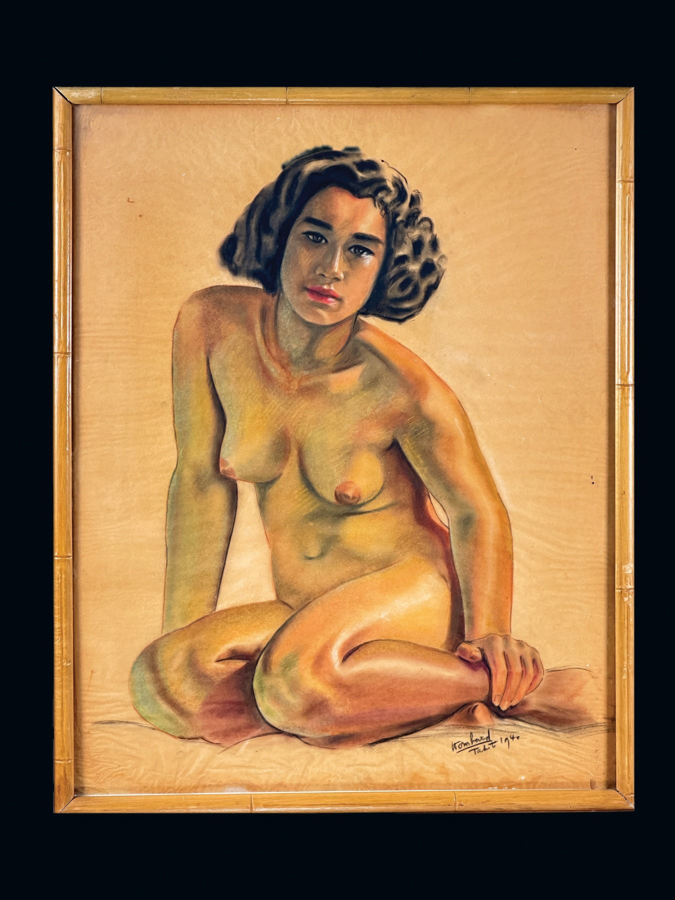 (1940) A lively nude portrait in pastel on paper signed and dated "Hanford - Tahiti- 1940. In vintage frame. VG+ with light wear to frame and paper. Uninspected outside of frame. 20"x25" frame, 18.5"x23.5" painting.