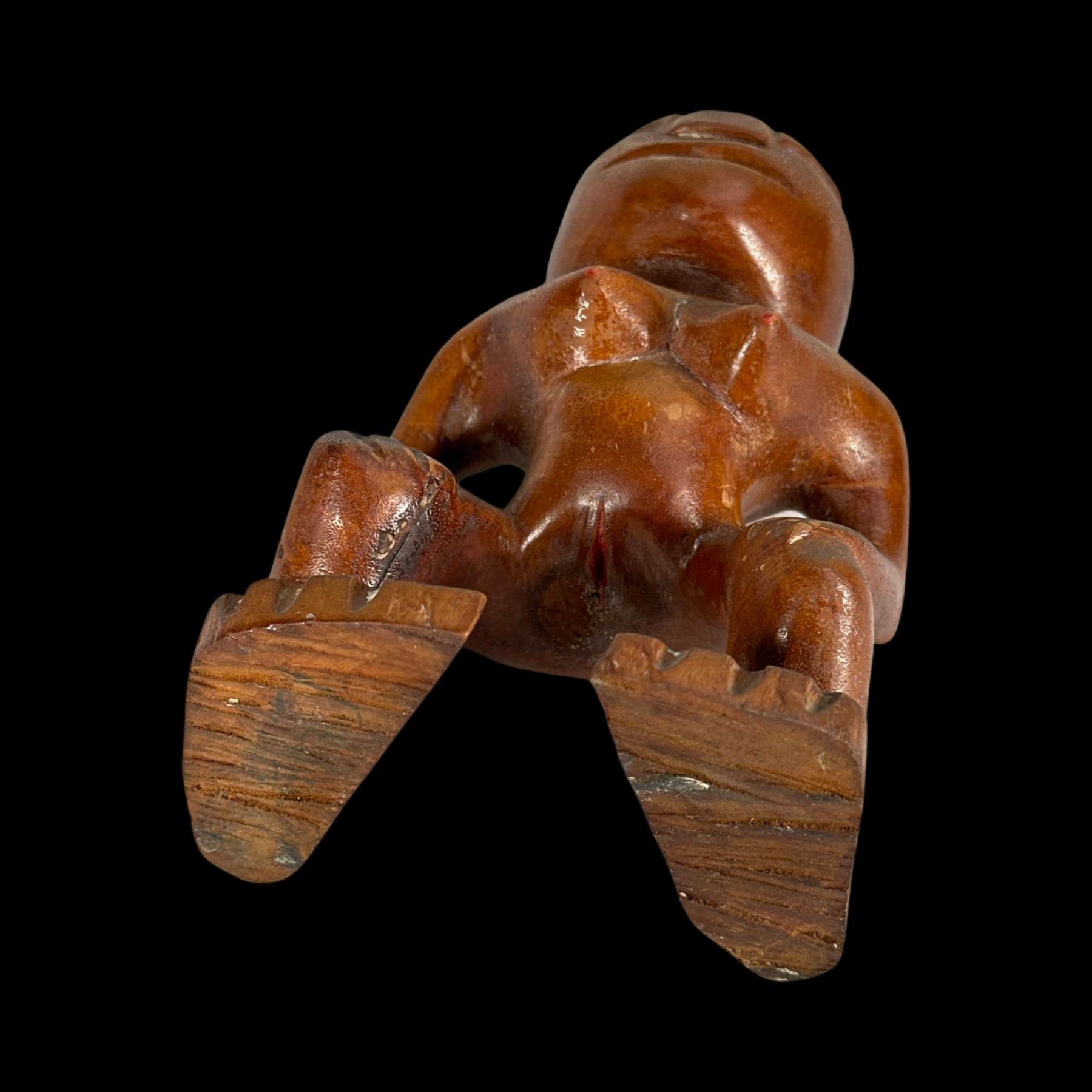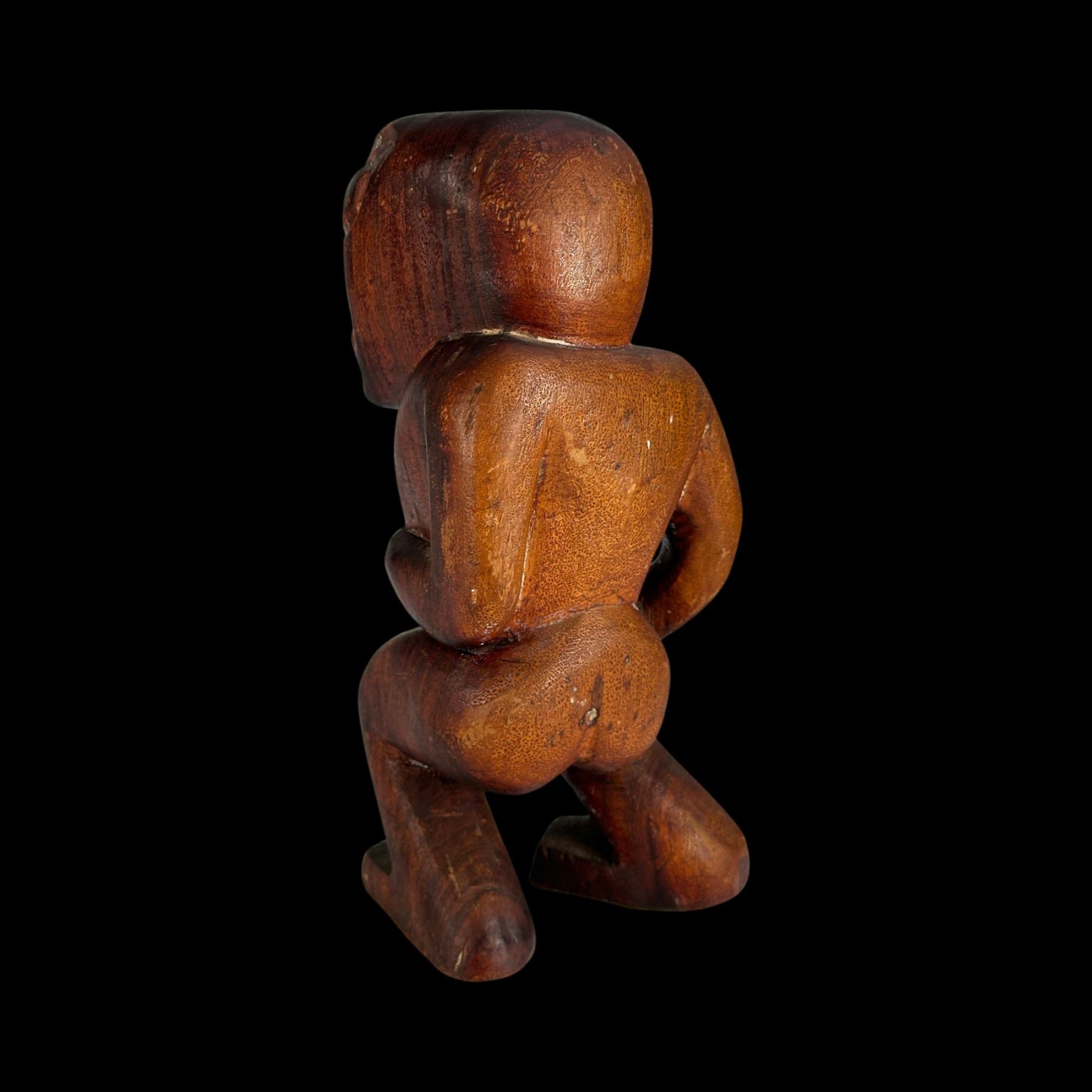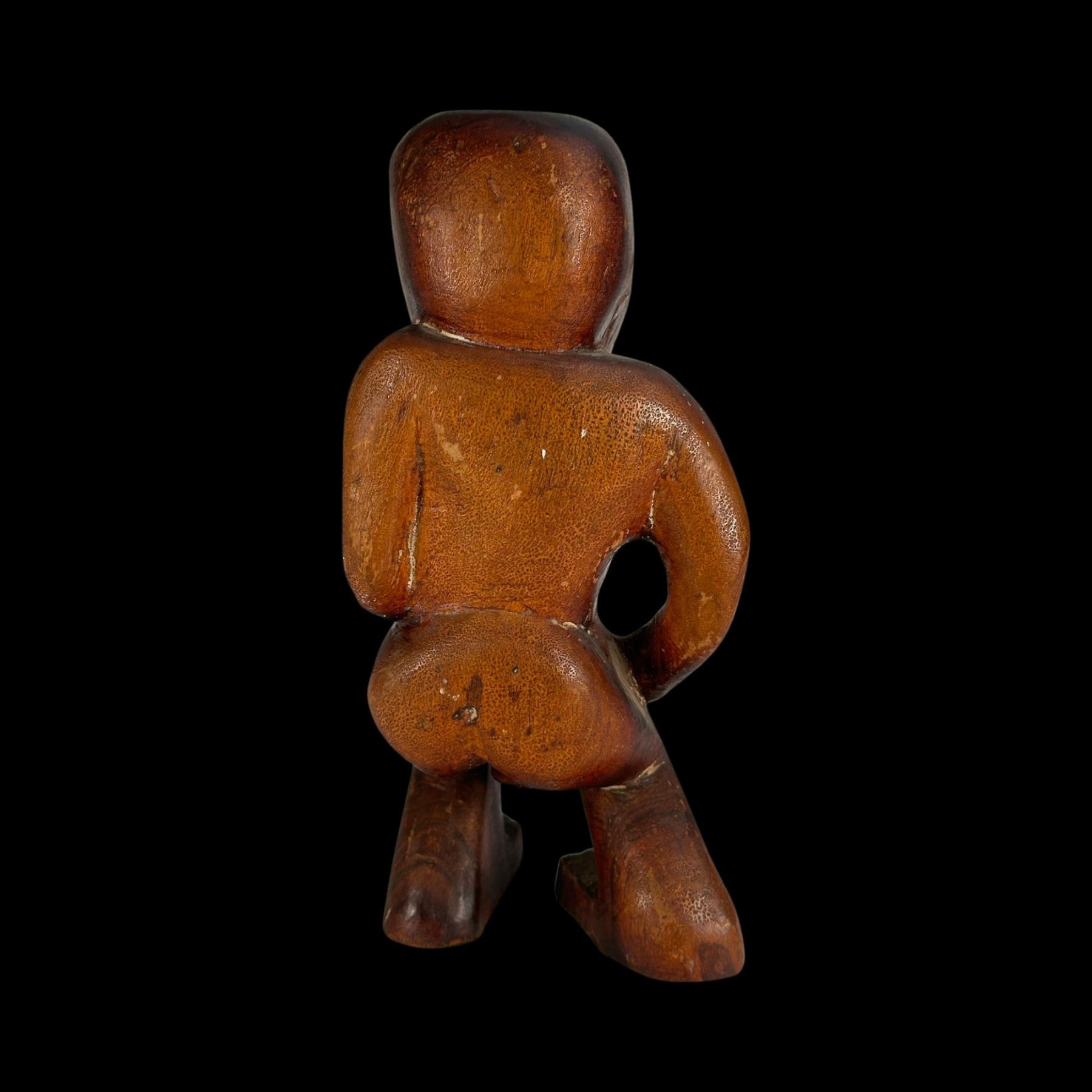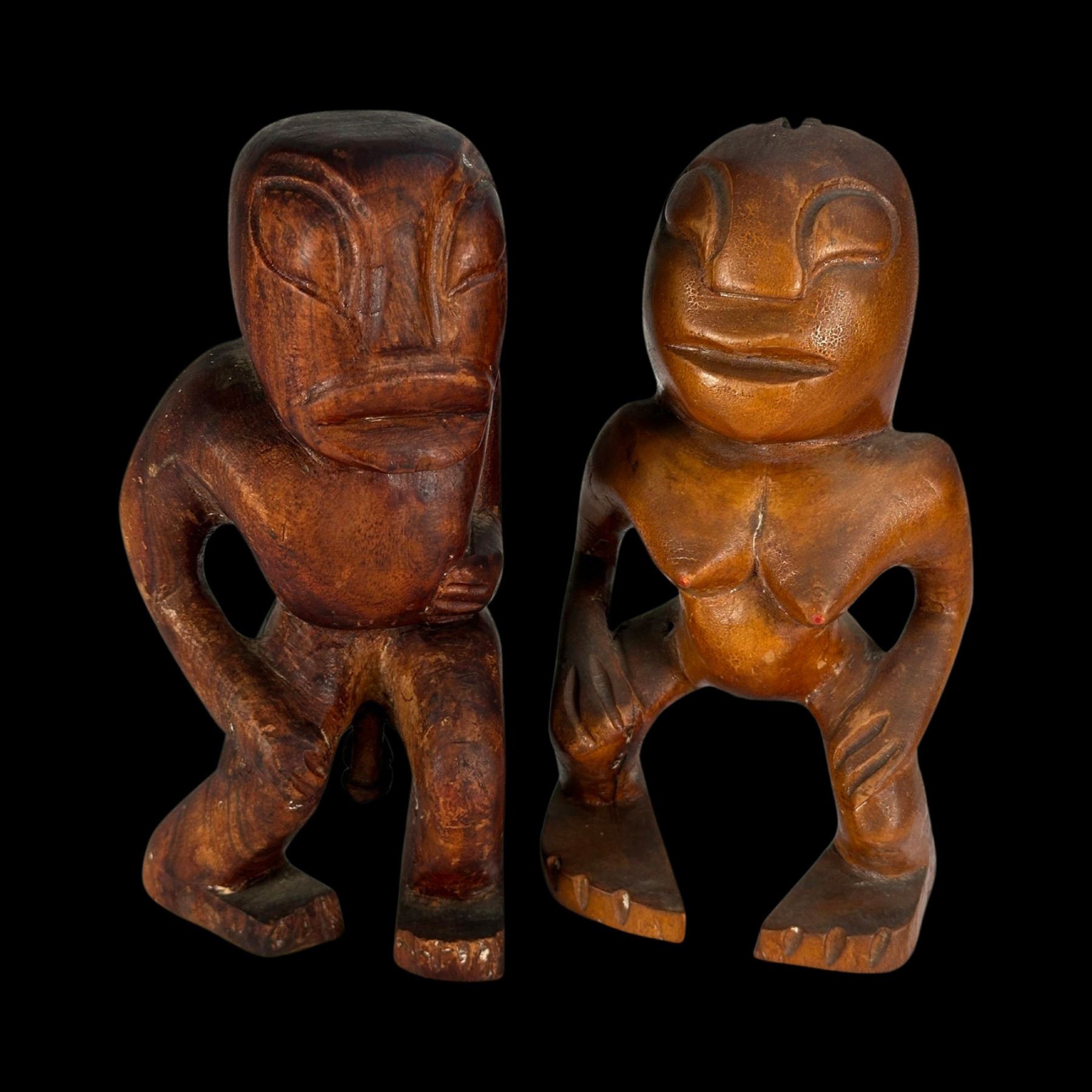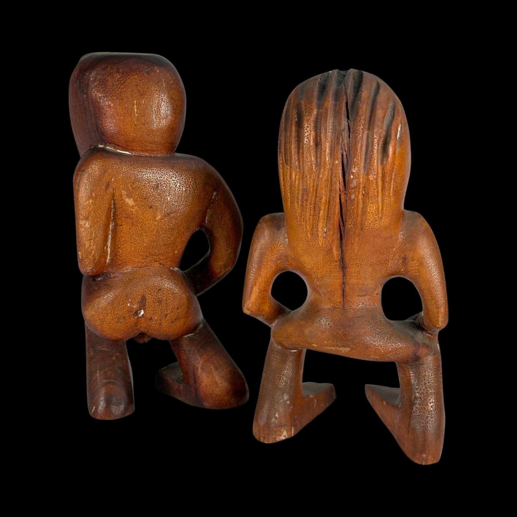 (1940s)* Early Poly-Pop figurative carvings collected by the first armchair travelers to suburban primitive paradise in their own backyards. Typical adult humor decor pieces reserved for the rumpus room where kids were not allowed. These are the very types of primitive novelties displayed in the personal homes of Vic Bergeron and Ernest Gantt. VG+ with typical wear. 5"x10.25"x4.5", 5.25"x10.25"x3.5".