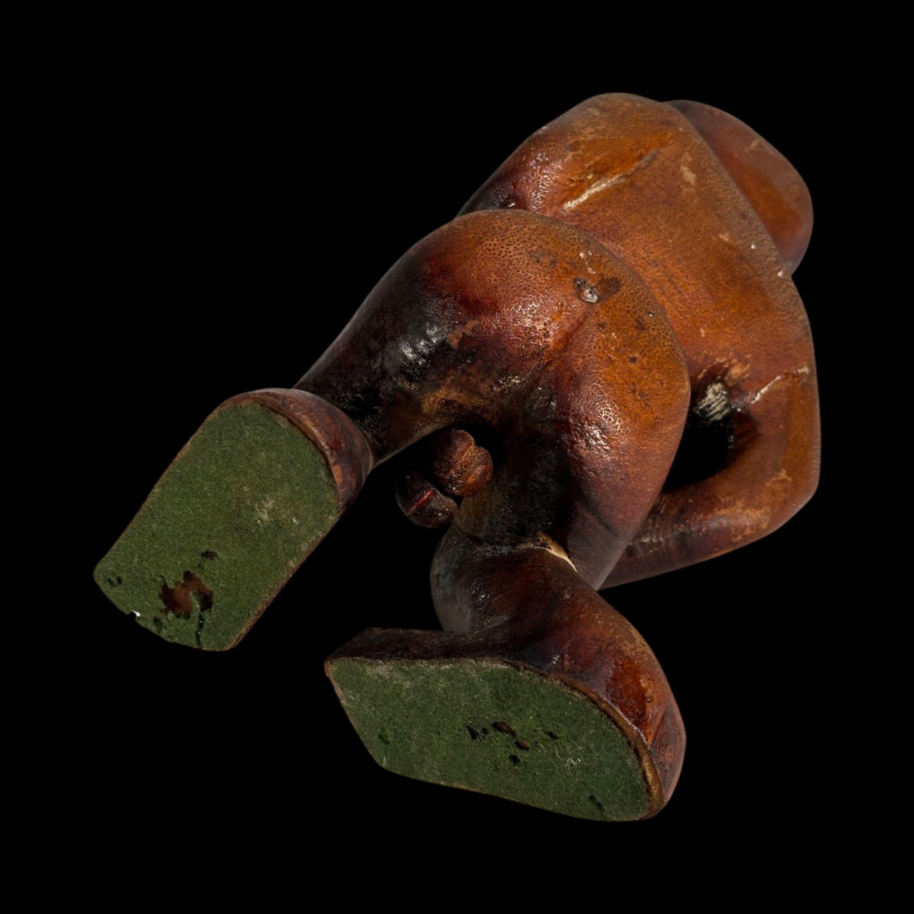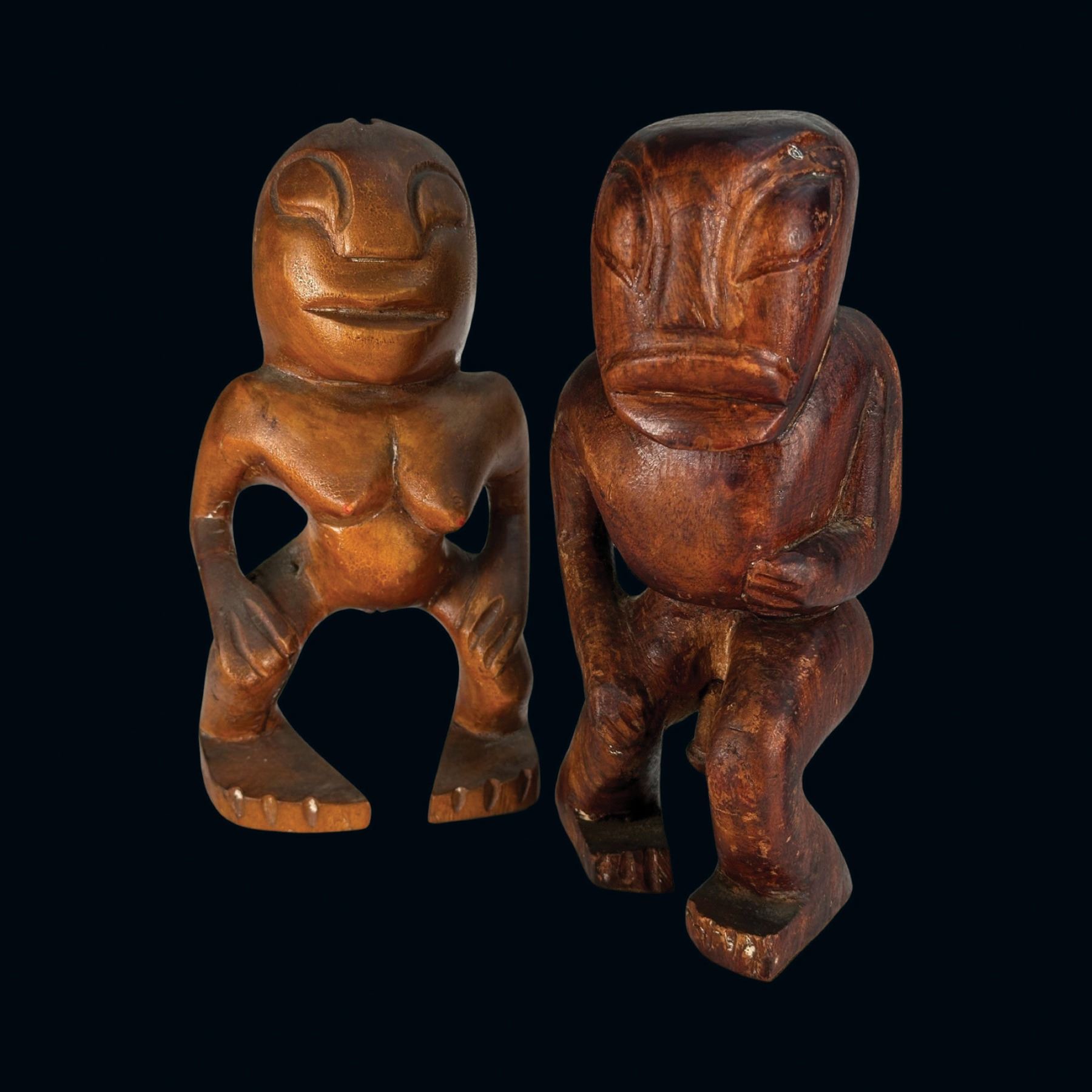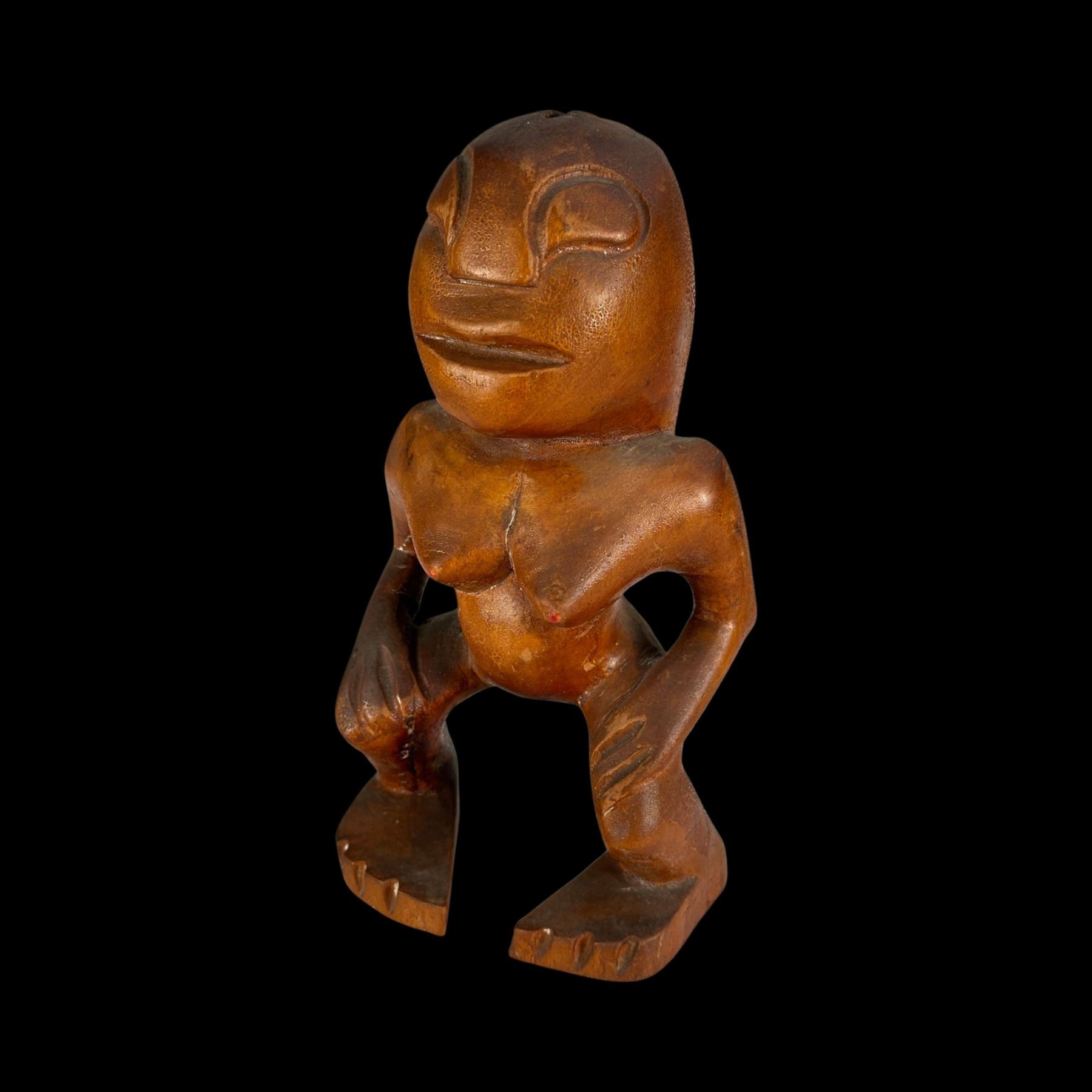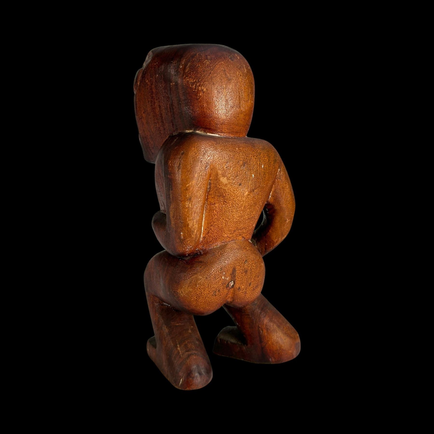 (1940s)* Early Poly-Pop figurative carvings collected by the first armchair travelers to suburban primitive paradise in their own backyards. Typical adult humor decor pieces reserved for the rumpus room where kids were not allowed. These are the very types of primitive novelties displayed in the personal homes of Vic Bergeron and Ernest Gantt. VG+ with typical wear. 5"x10.25"x4.5", 5.25"x10.25"x3.5".