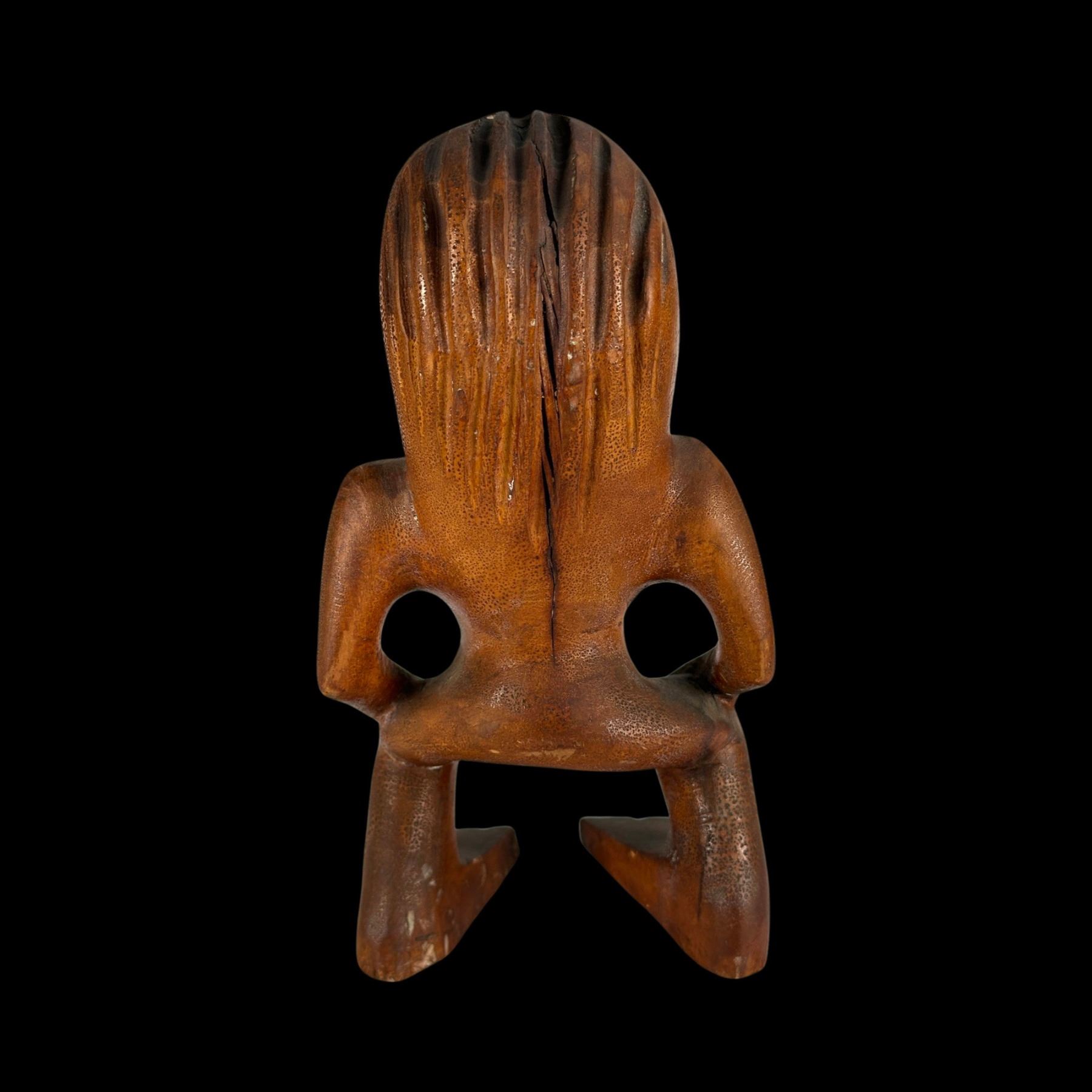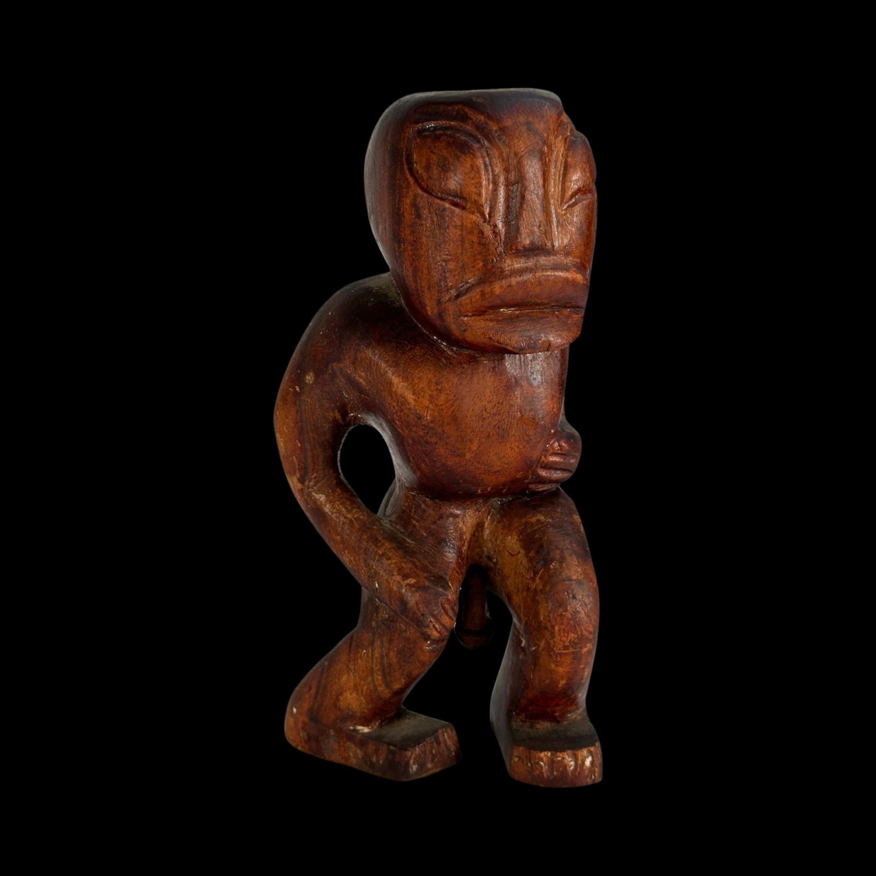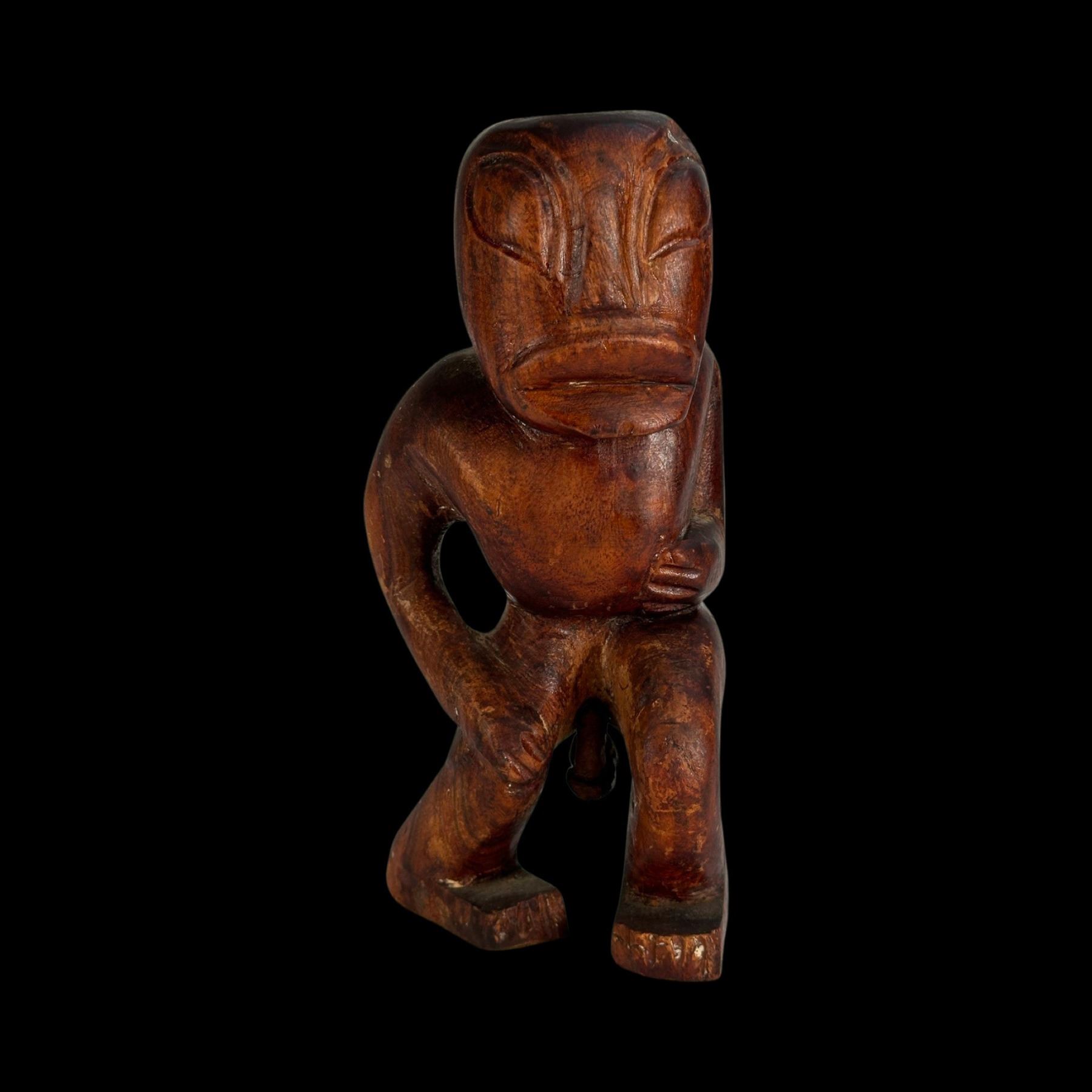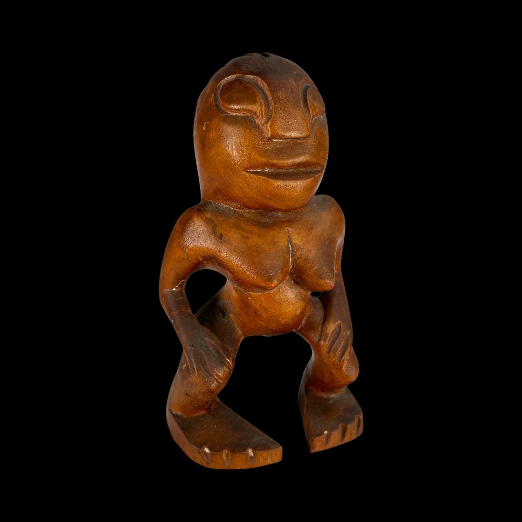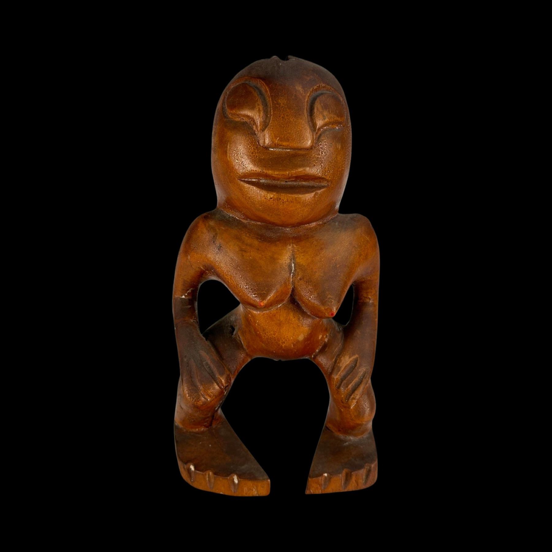(1940s)* Early Poly-Pop figurative carvings collected by the first armchair travelers to suburban primitive paradise in their own backyards. Typical adult humor decor pieces reserved for the rumpus room where kids were not allowed. These are the very types of primitive novelties displayed in the personal homes of Vic Bergeron and Ernest Gantt. VG+ with typical wear. 5"x10.25"x4.5", 5.25"x10.25"x3.5".