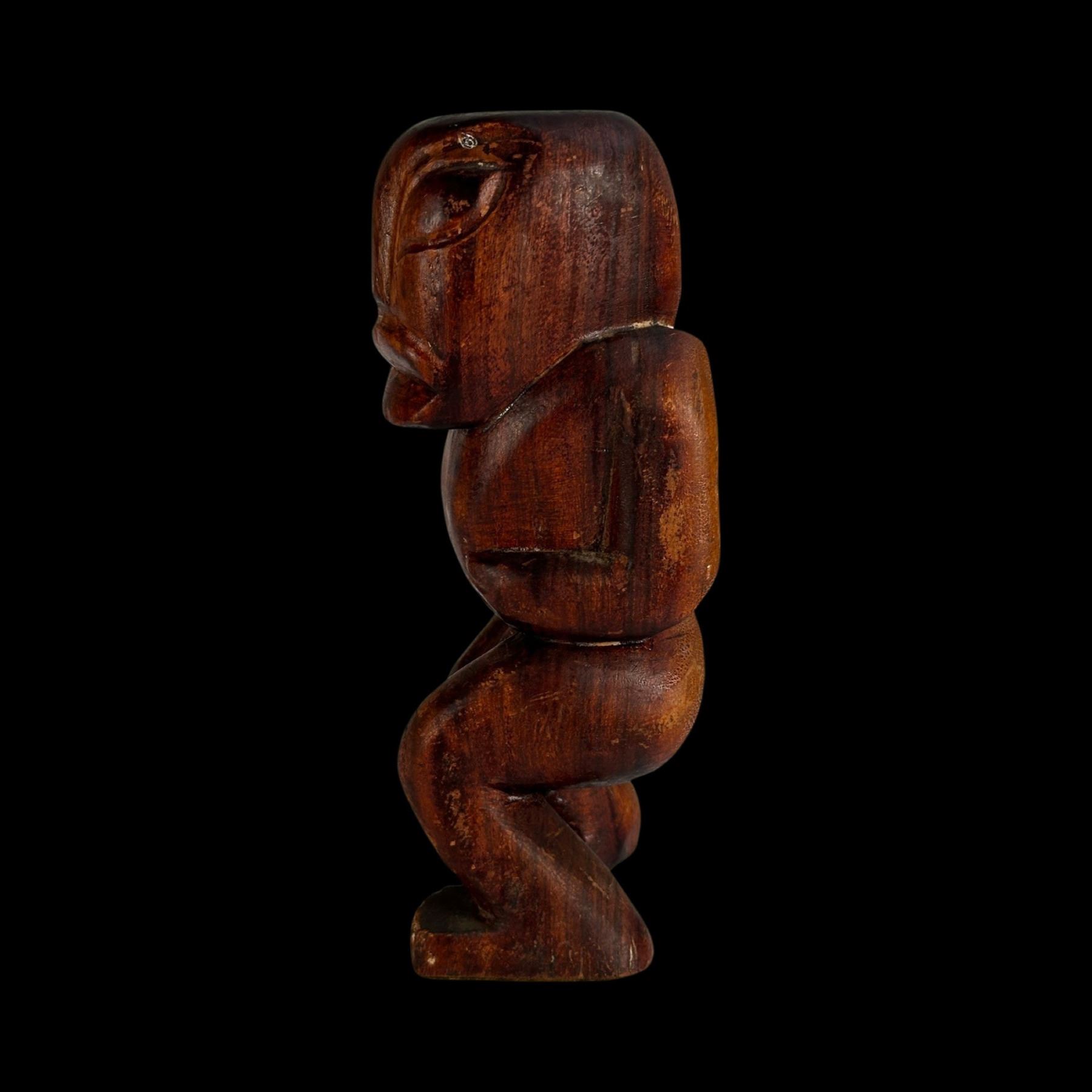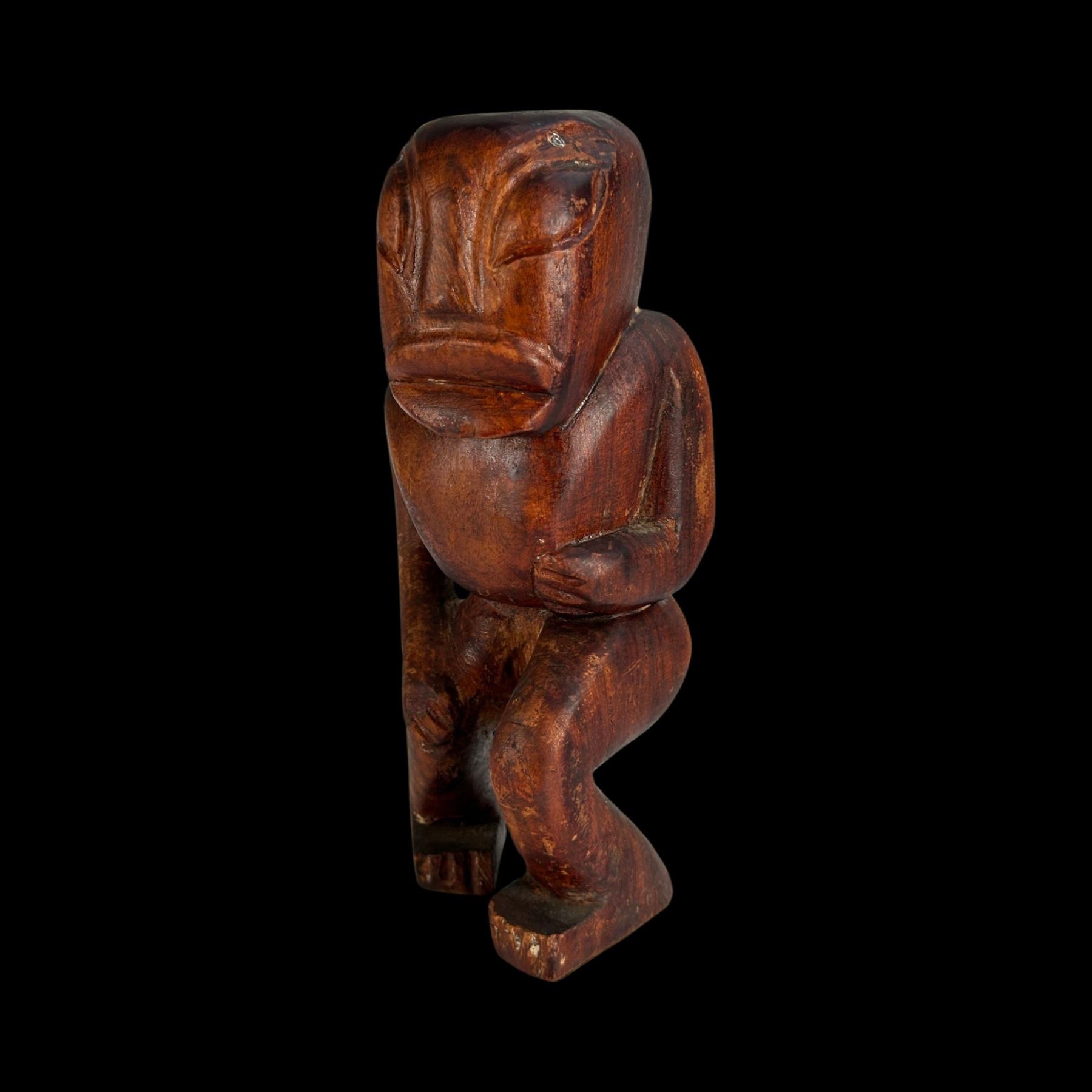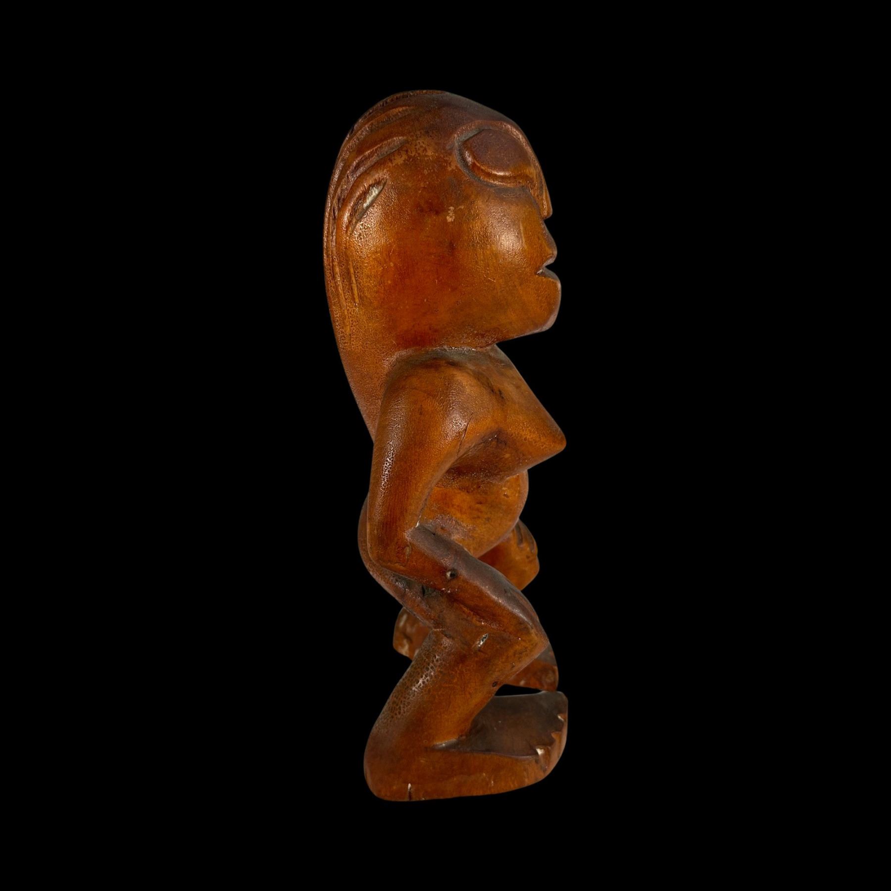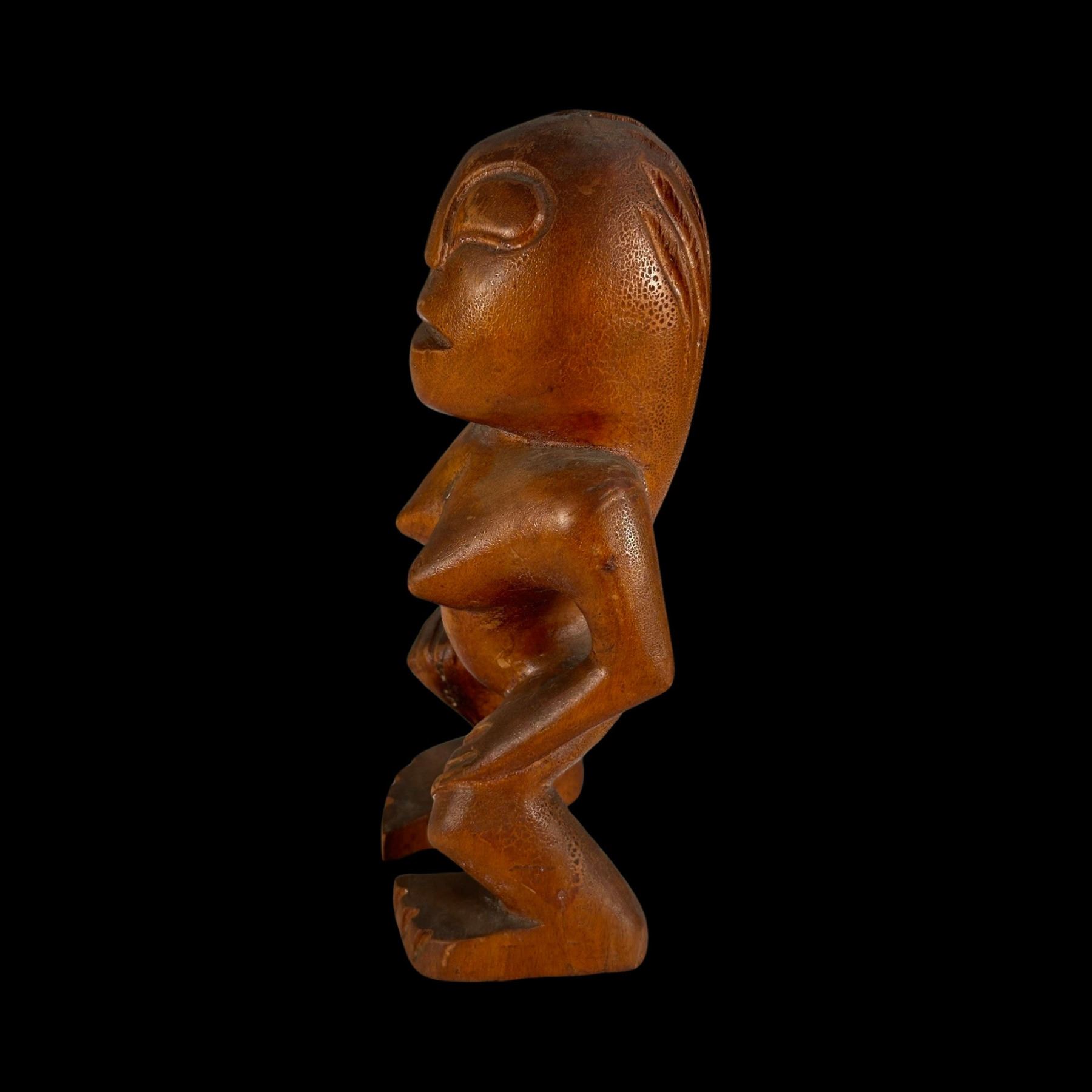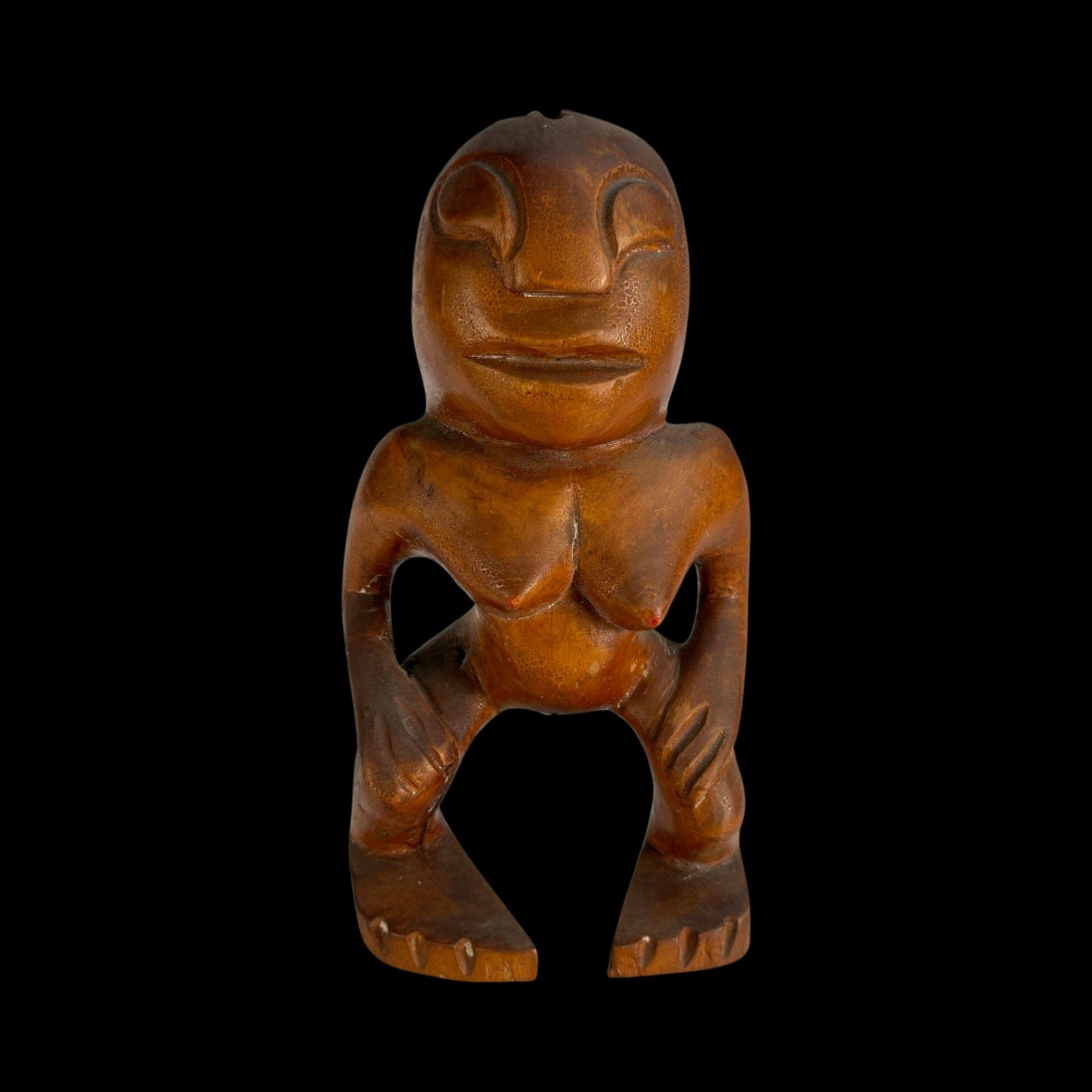 (1940s)* Early Poly-Pop figurative carvings collected by the first armchair travelers to suburban primitive paradise in their own backyards. Typical adult humor decor pieces reserved for the rumpus room where kids were not allowed. These are the very types of primitive novelties displayed in the personal homes of Vic Bergeron and Ernest Gantt. VG+ with typical wear. 5"x10.25"x4.5", 5.25"x10.25"x3.5".