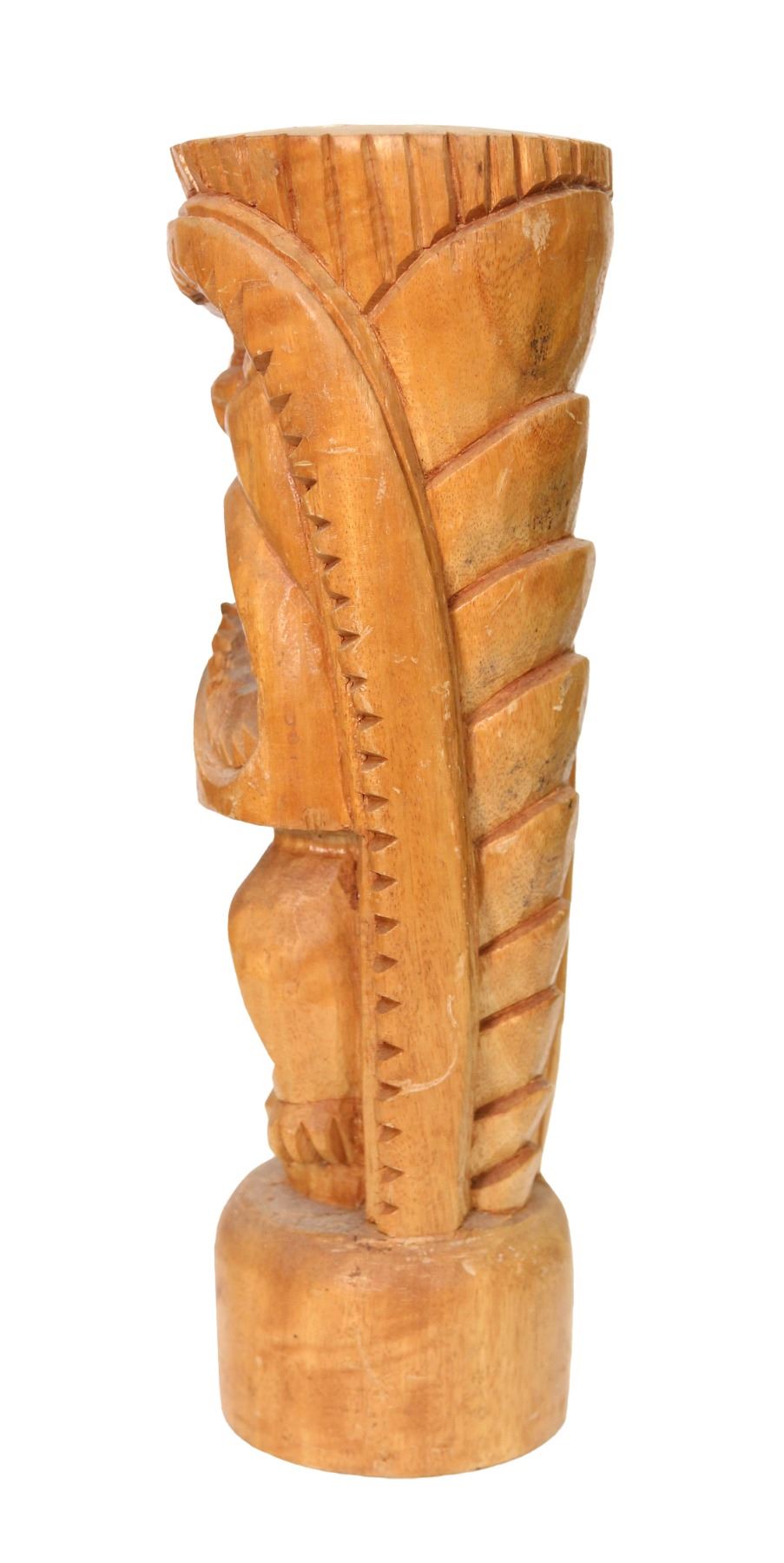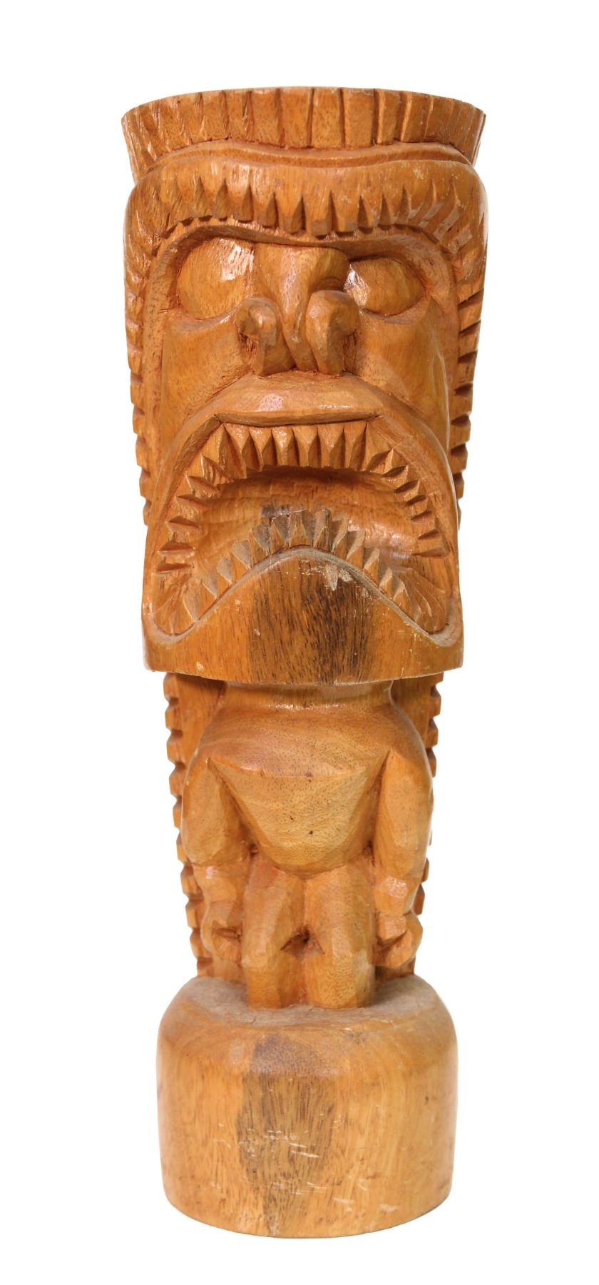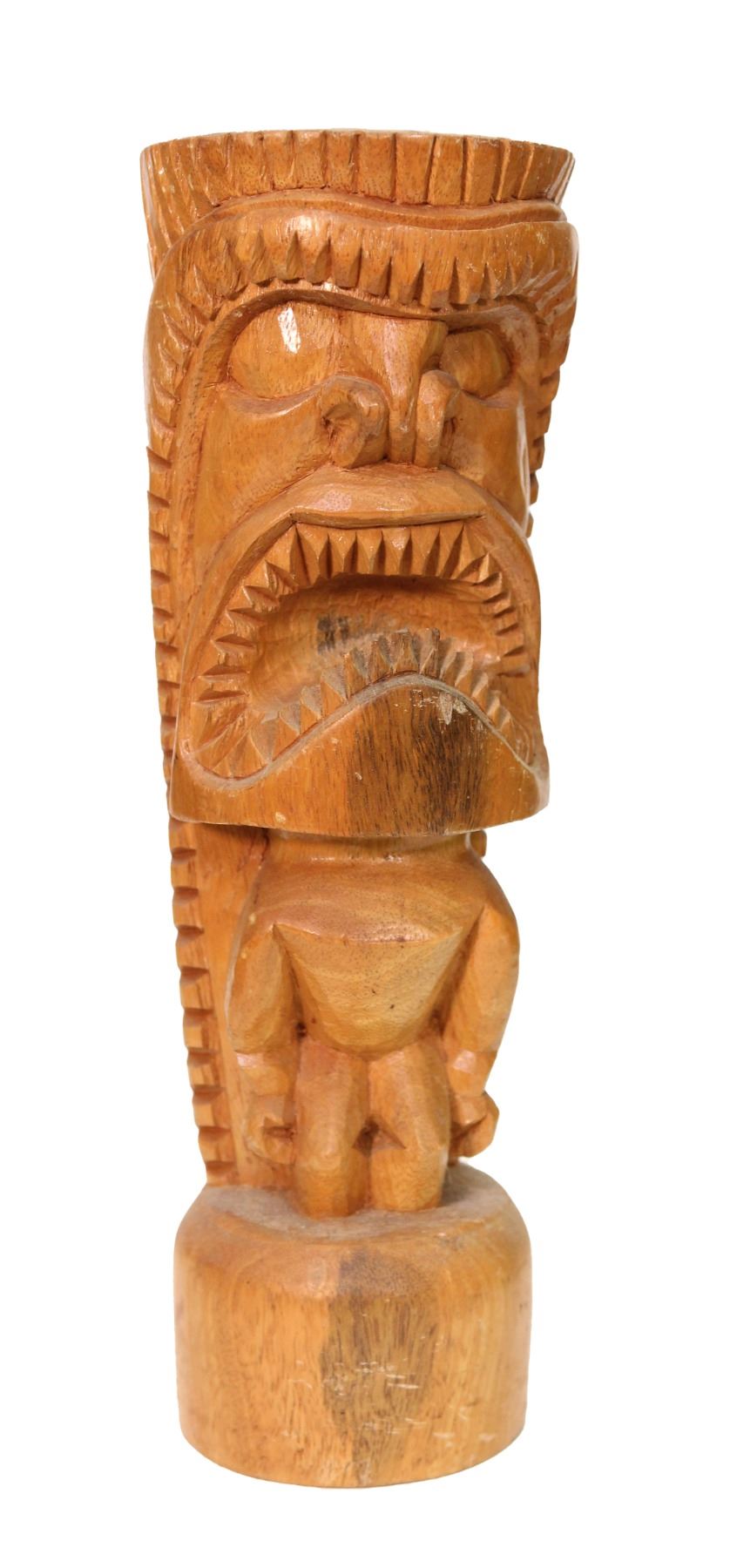 (1960s) Open wide with this hand carved Tiki figure featuring a huge mouth with sharp, pointed teeth. Possible Prison Tiki or perhaps one of the carvers trained there and sold on their own. Definitely of that school of carving. Solid wood on base. 12.75"x4.5". VG+.