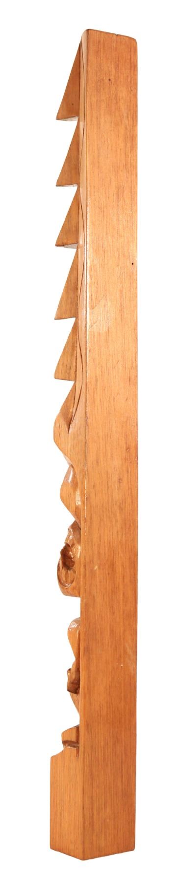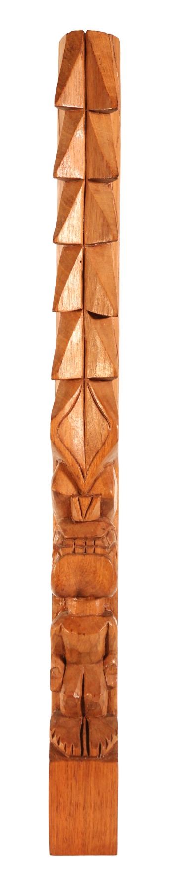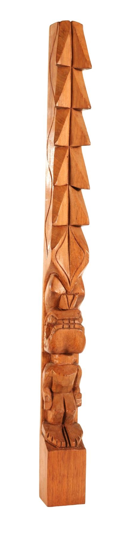 (1960s) In island culture a high headdress signified closer attachment to the heavenly Gods. This one is about as high as you can go with its astonishing height placed atop a small Tiki figure. Unique Tiki design. Solid wood. 21.75"x2"x1.5". VG+.