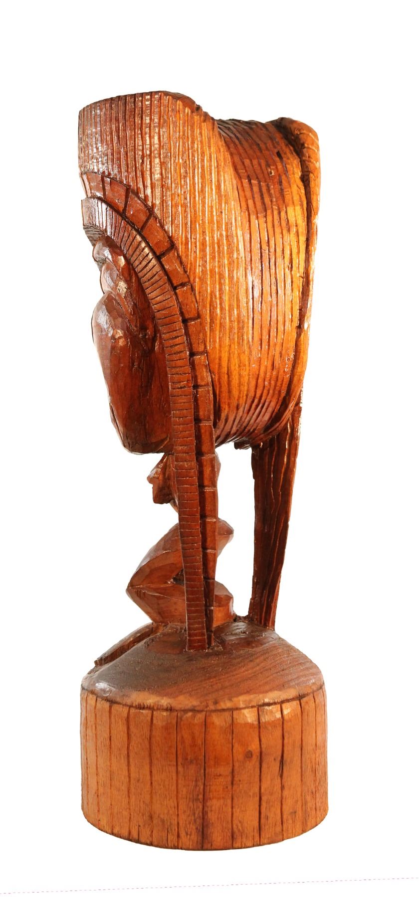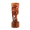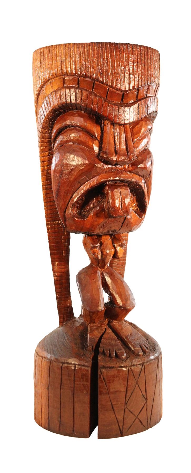 (1960s) A very unique Tiki! The individual cuts of KU's headdress and long trails make for an exceptional look on this hand carved Tiki figure. Features open mouth with tongue exposed and wide, bare feet on base. Solid wood. 21"x7.5". VG natural wear with noticeable wood split in base.