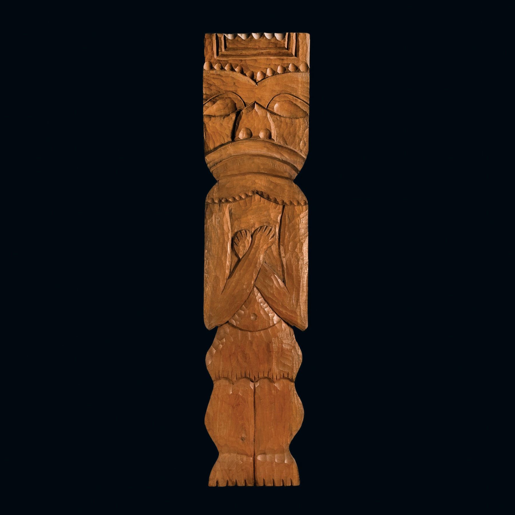 (1960s) A nice fantasy tiki carving from the 1960s. Possible commercial decor. VG+. 6.25"x26.75".
