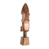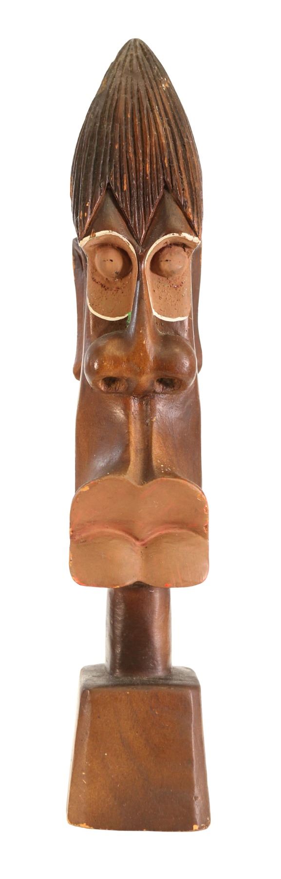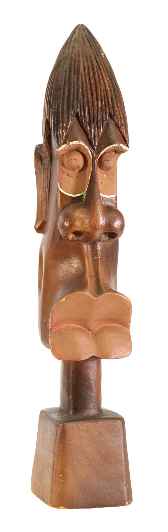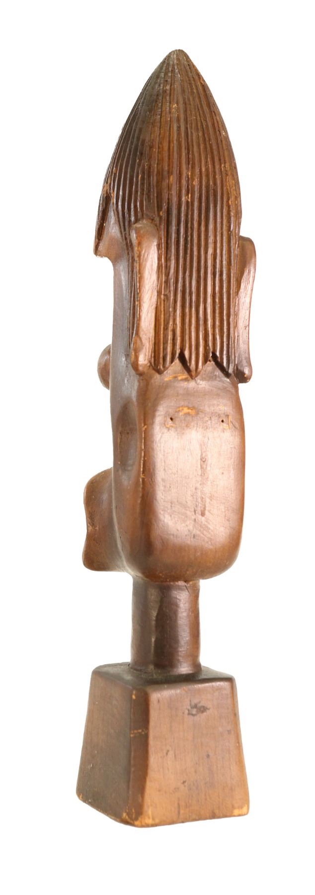 (1960s) The extreme exaggeration of the pointed headpiece and facial features on this hand carved tribal figure makes an outstanding work of craftsmanship and art. Solid wood. 16.5"x3".VG with small mount holes on back of item.