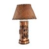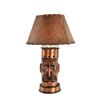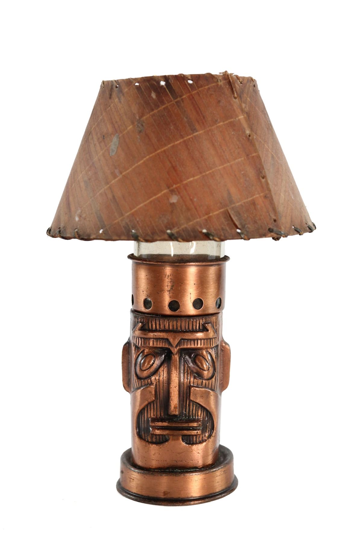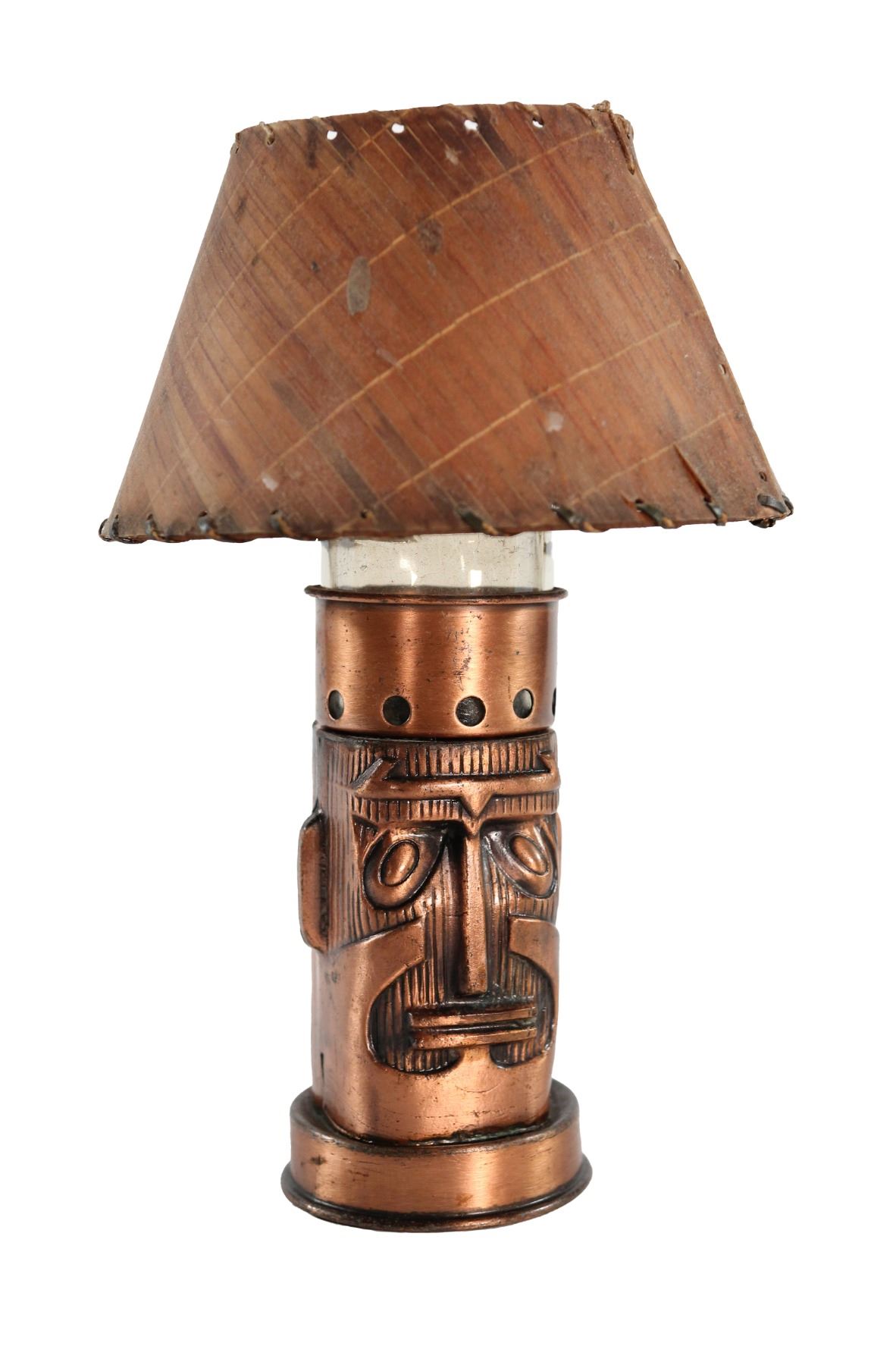 (1960s) Fantastic copper Tiki table lamp with hurricane glass insert and authentic shade with thin trim weave on top and bottom. These were used in Polynesian restaurants across the country and are patterned after the ceramic "Kon Tiki" mug by OMC. Great Tiki design perfect for a tropical atmosphere. 10"x3.5". (Shade-7" dia.). Lamp: VG+, Shade: VG some minor wear and tear on shade.