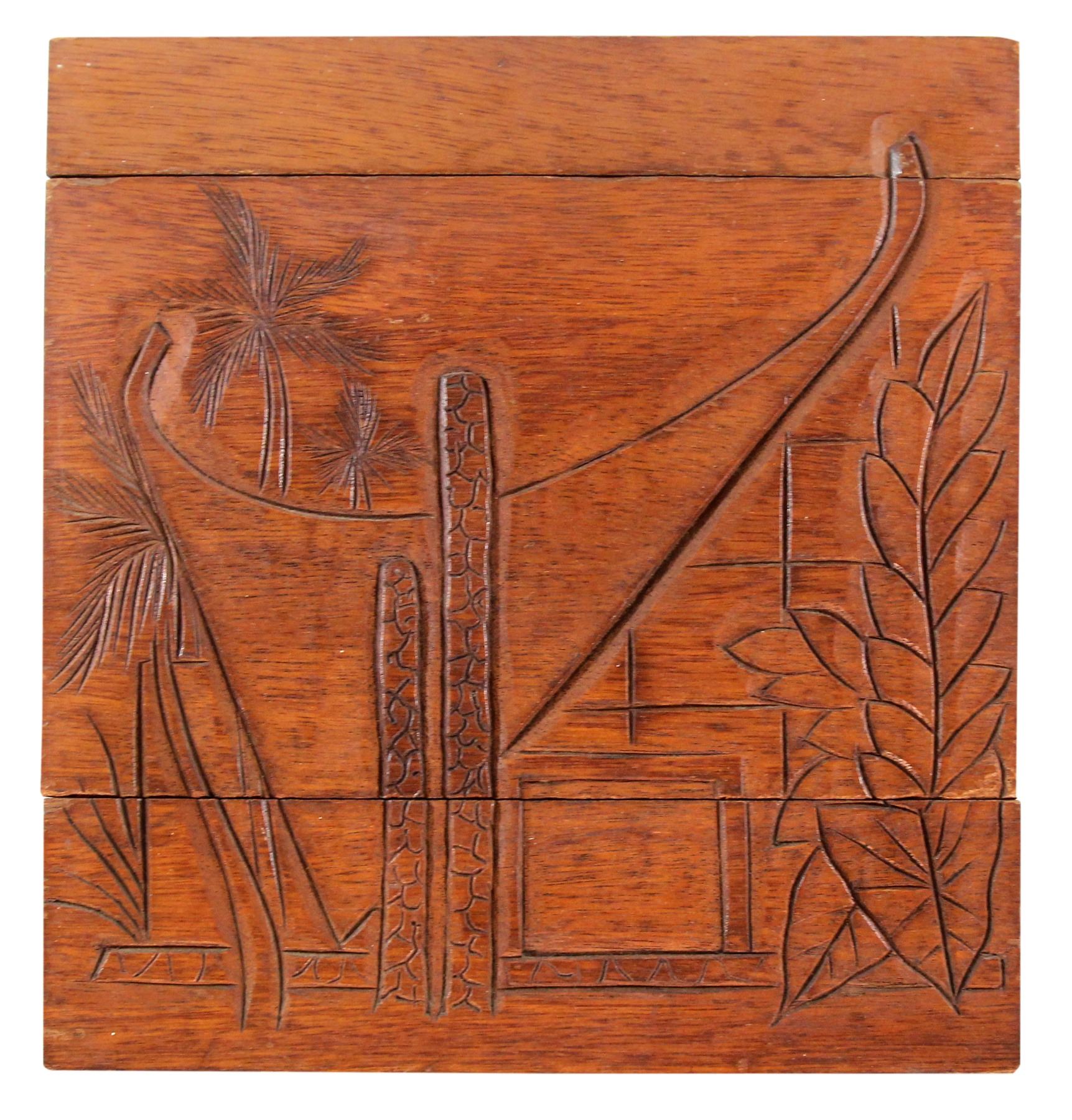 (1960s) A ULTRA RARE signature rendering of the famous exterior of The Waikikian resort hotel. This amazing carved wood plaque was affixed to the mid century modern writing desks found in the larger suites at the resort. It's a testament to the high end details of this groundbreaking commercial Polynesian Pop enterprise. Charming depicting the dynamic slanted roof architecture against swaying palms. Engraved wood. 14"x8.75". VG+.