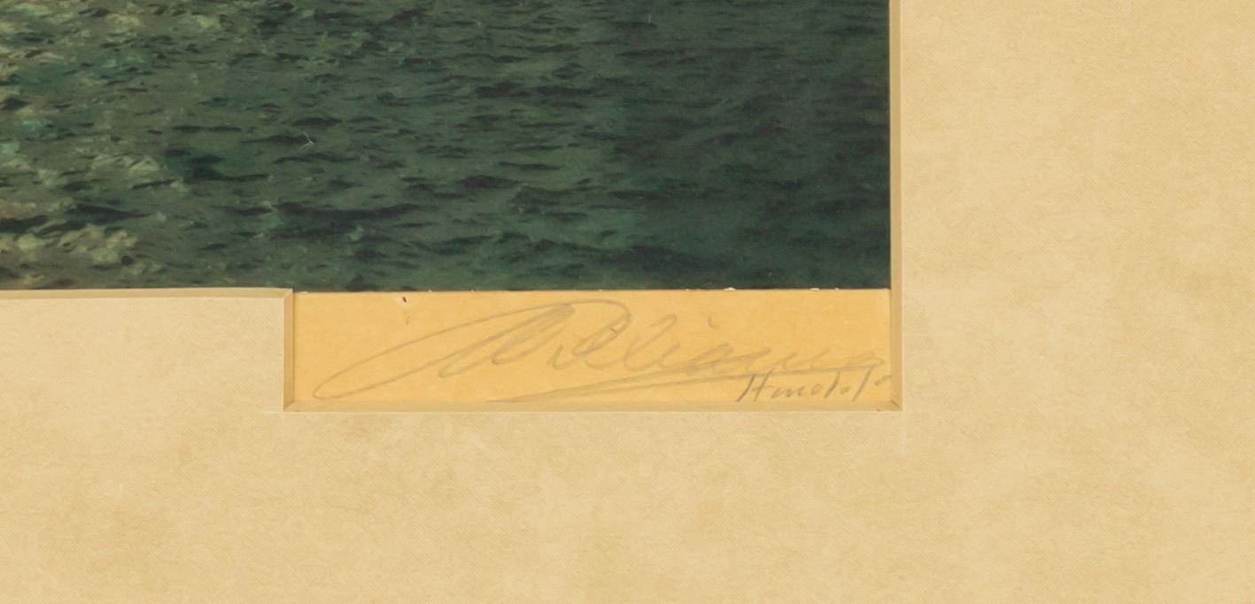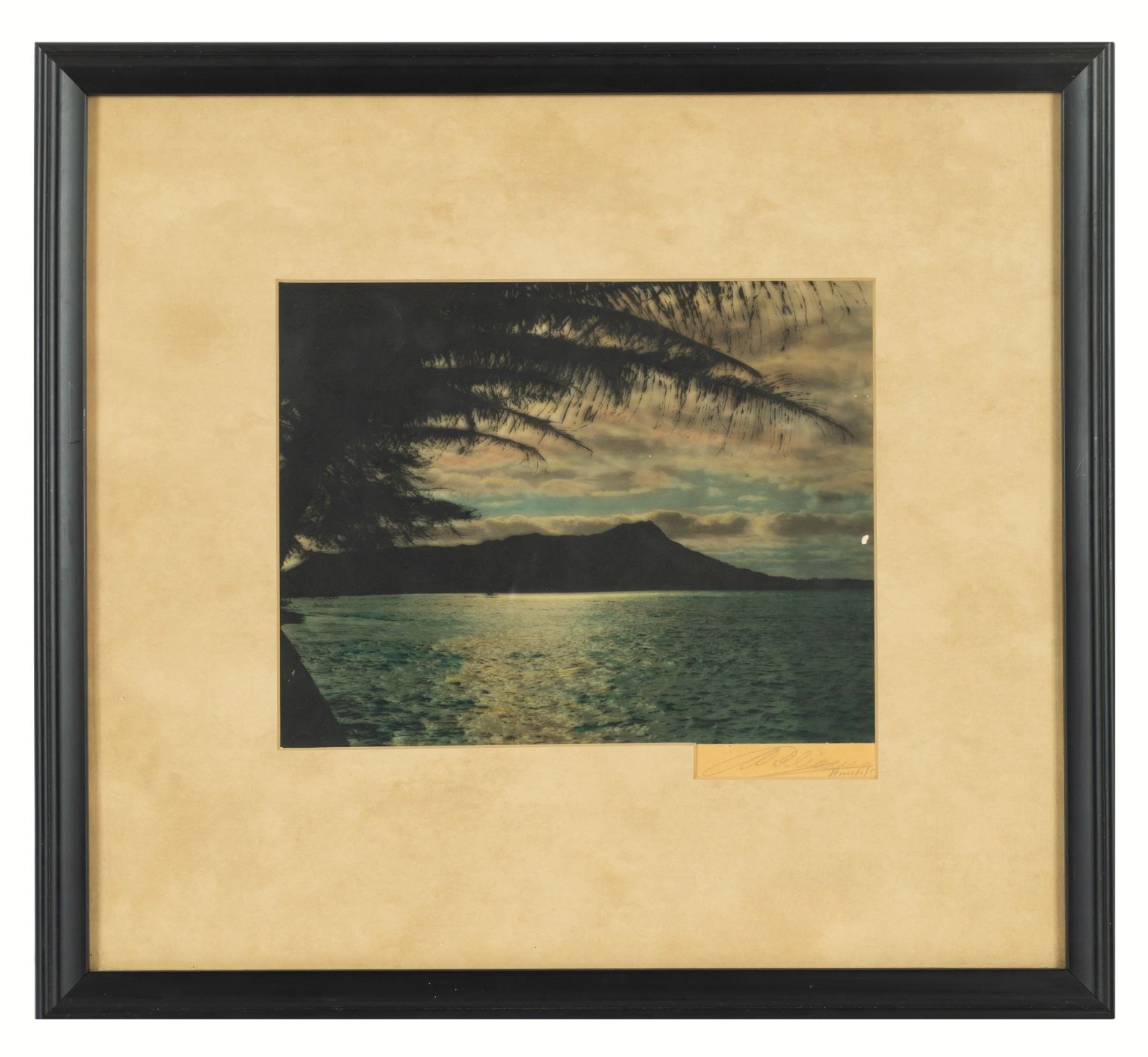Moody vintage hand-tinted photographic print of a peaceful twilight on a tropical beach with palms and background island hills. Mat board with glass and wood frame. Signed in pencil by unidentified photographer. *SEE DETAIL PHOTO. 16.5"x15". VG+.