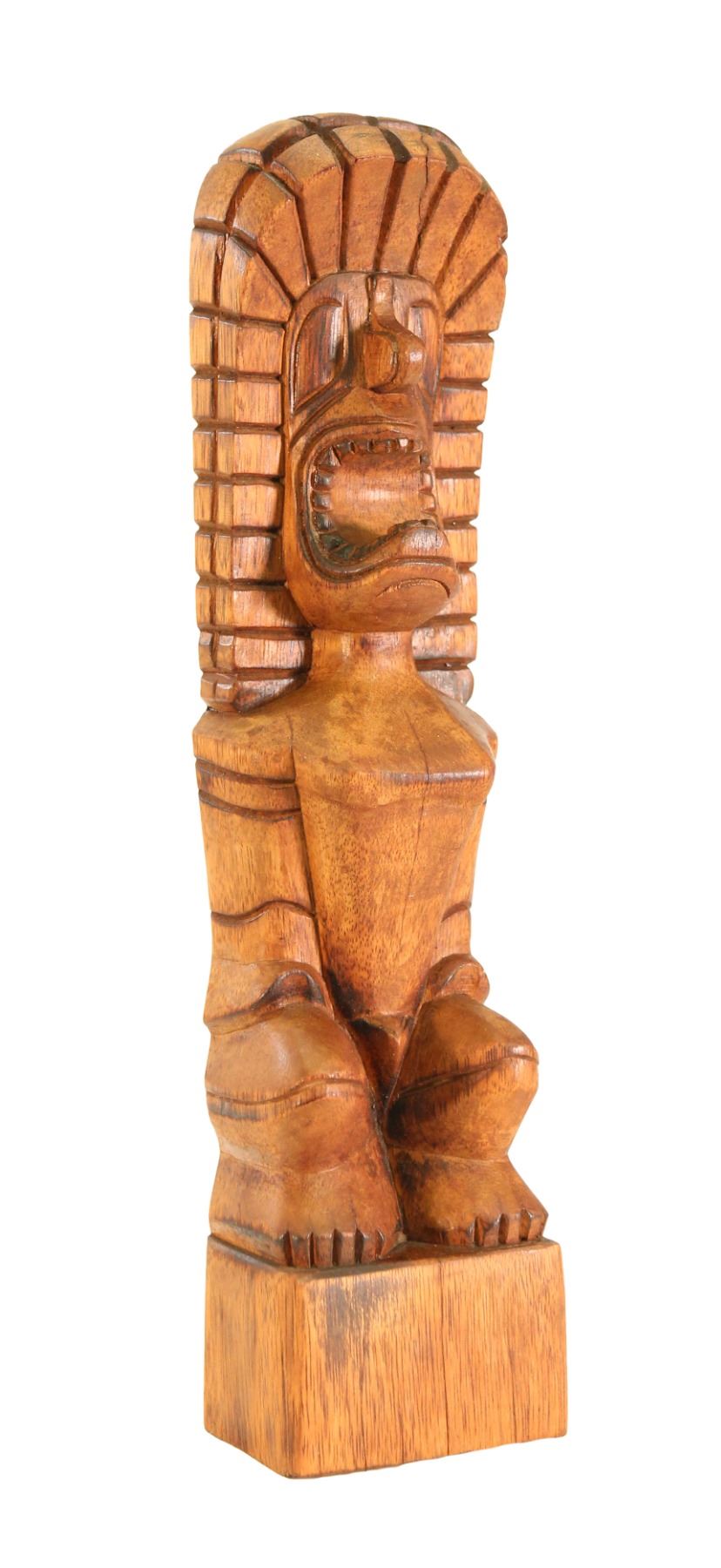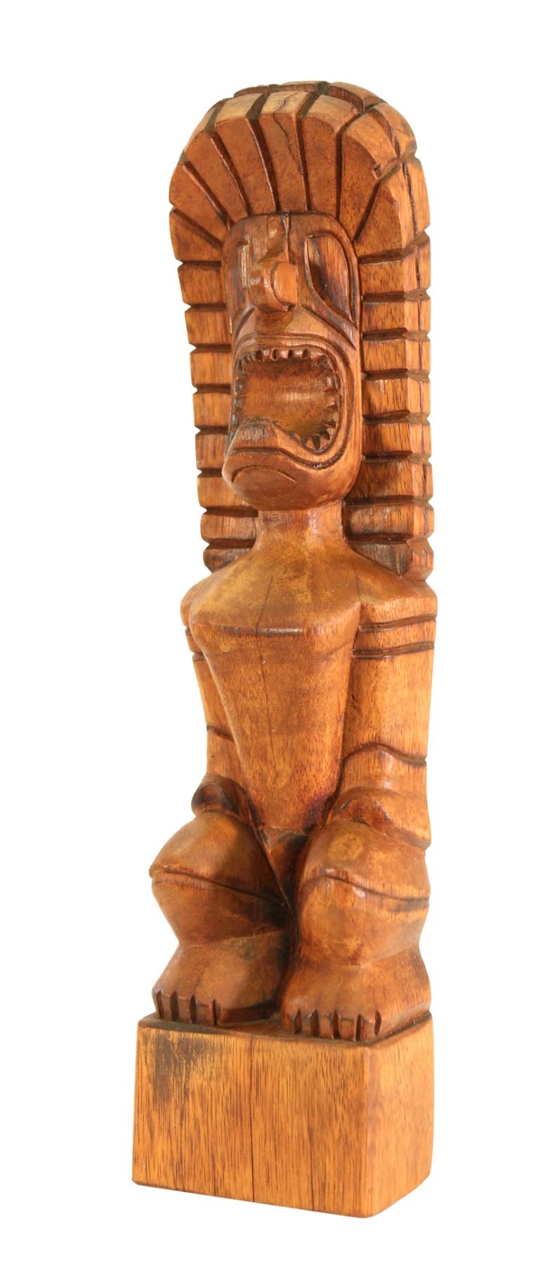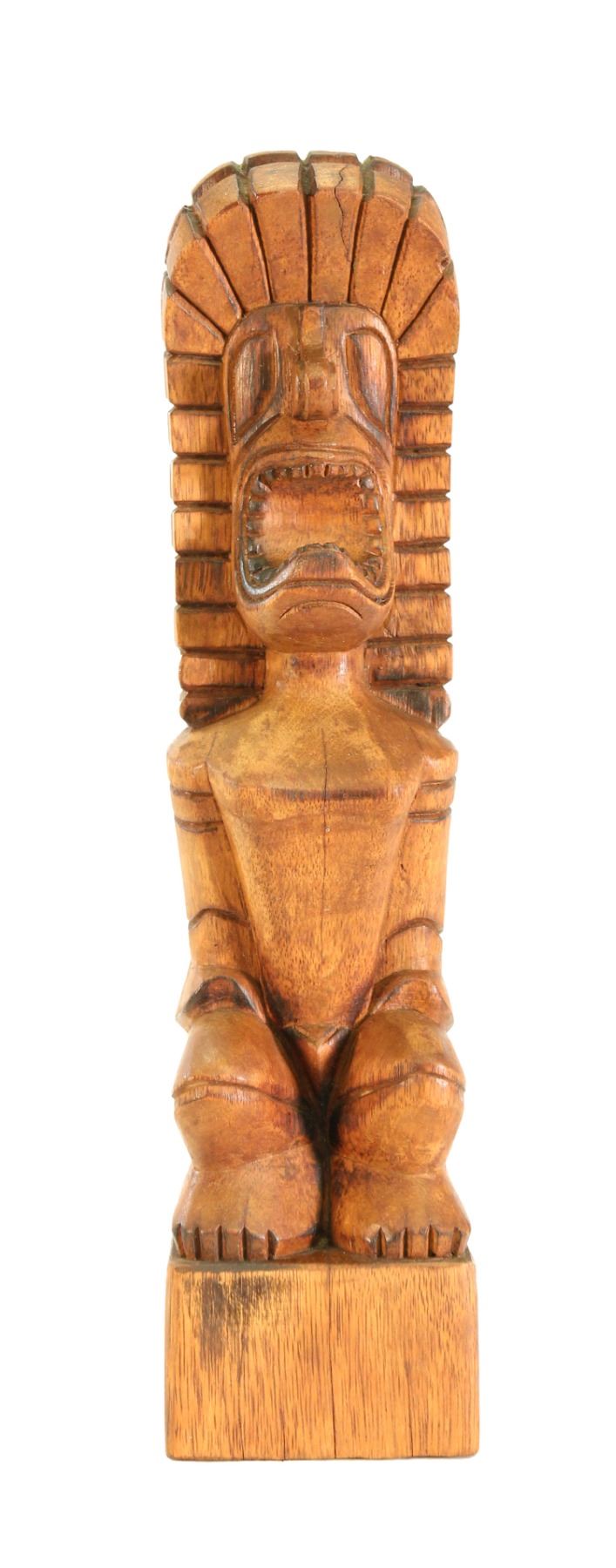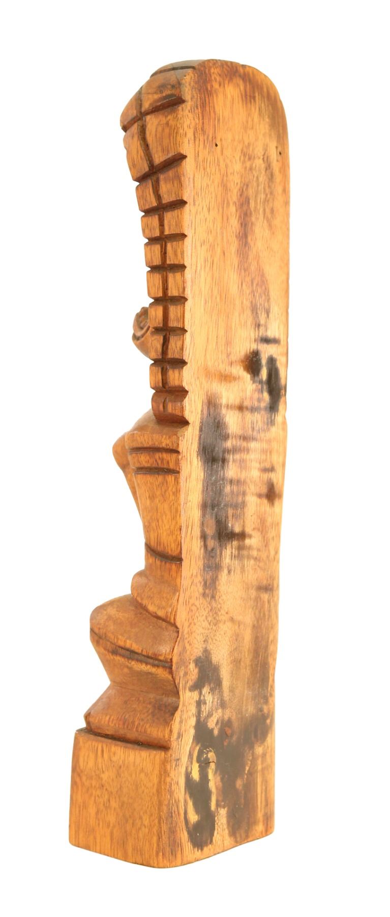 (1960s) Hand carved Tiki idol shows the long facial features predominate in Tiki statues. Here, we find an impressionistic KU stylized, most probably for the tourist trade. Solid wood on base. 14.5"x3.5". VG wear and discoloration on wood.