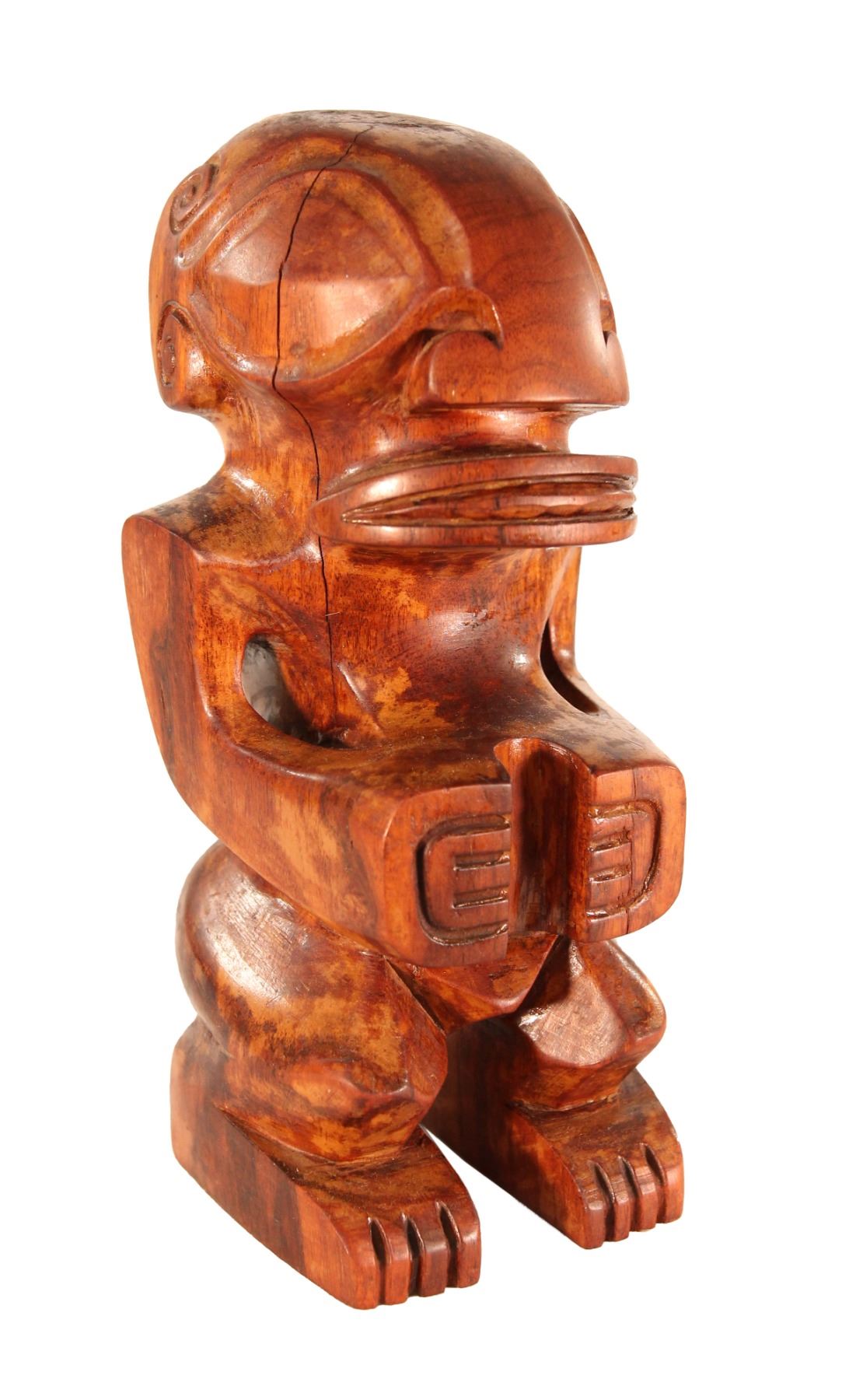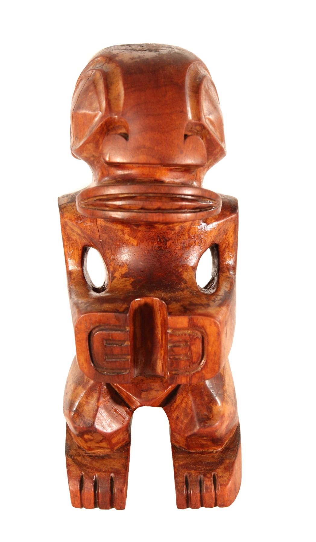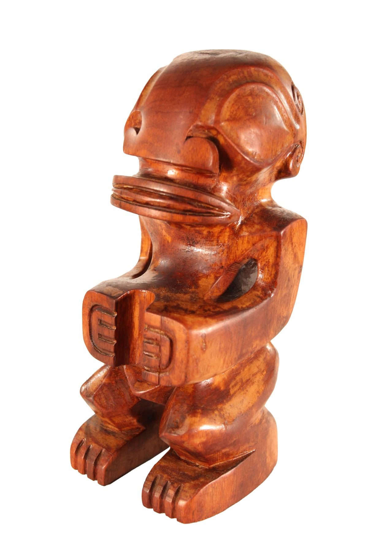 (1960s) Hand carved standing Marquesan Tiki idol made of smoothed, natural wood. A tourist item available in hotels and airports across Hawaii and Tahiti. 10.5"x5". VG+ with some minor wear and small mount holes on back.