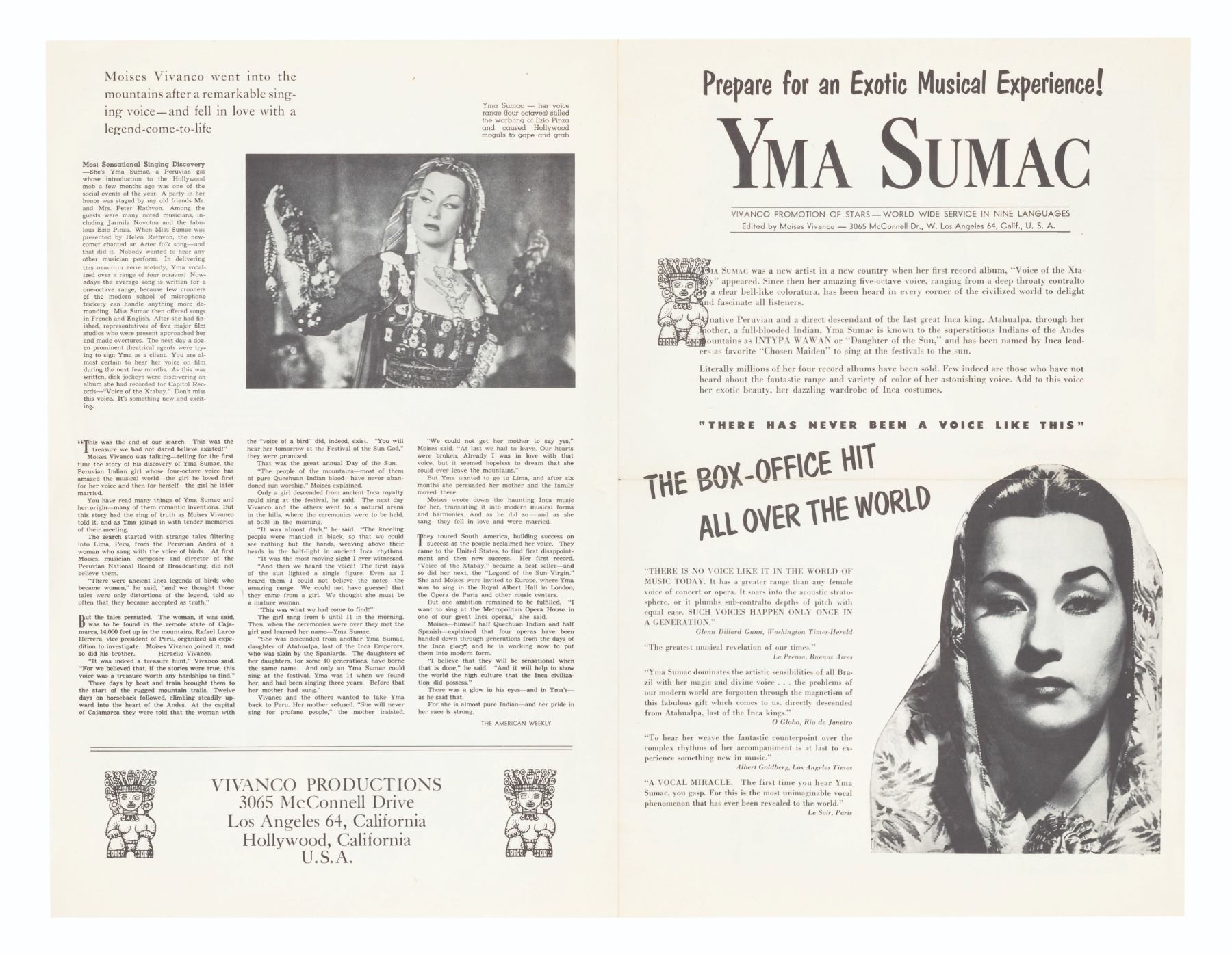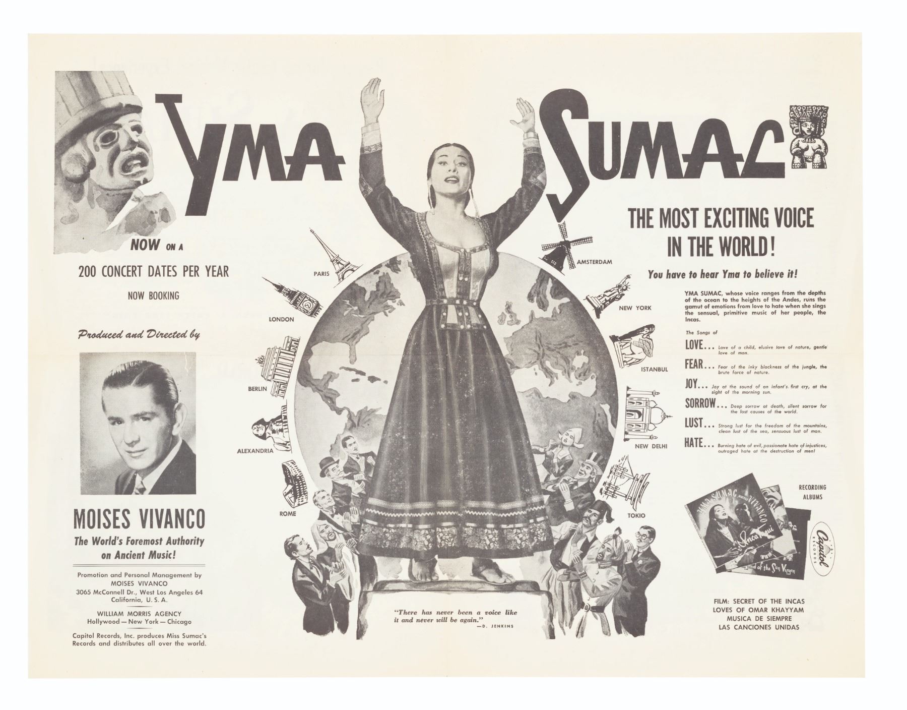 (1959). Vintage original promo poster created by Yma Sumac. When opened the center images create an exclusive poster. This was designed to attract bookings in only the best venues around the world. This item if from the personal archives of Yma and could only come from Yma herself. Not sold or released to the general public. From the official YMA SUMAC ARCHIVES collection, the piece is accompanied with a signed certificate of authenticity from curator, Damon Devine. 11"x17"-closed. VG+ with typical wear.