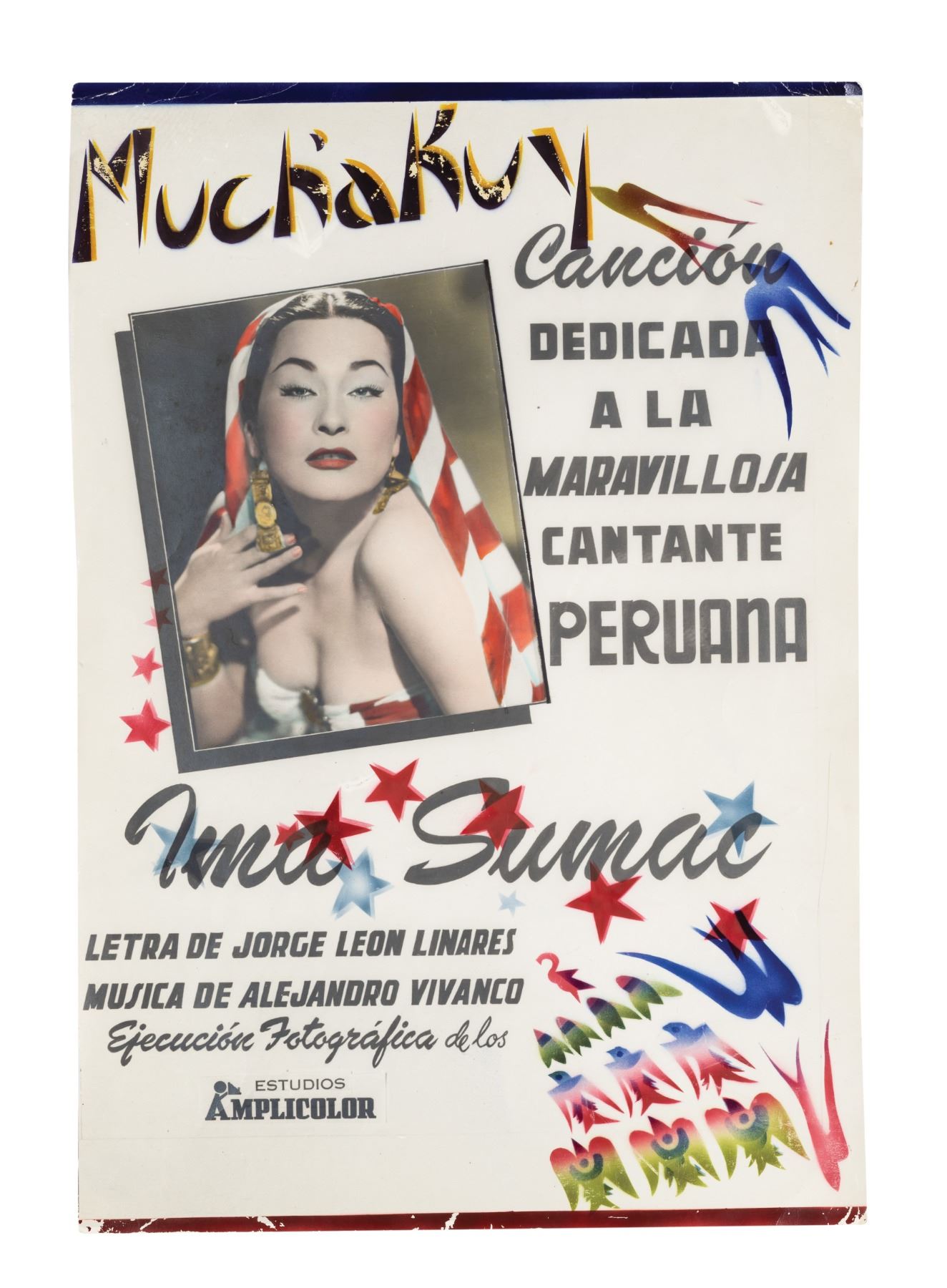 (1953). Vintage double-weight 1953 hand colorized photo from Peru used to promote "Muchakuy", a song in the Quechua Indian language dedicated to Yma Sumac for her first visit to the country after an 8-year absence. Sumac visited Peru only 7 times during her 60-year international career, so this is a very special piece of memorabilia. From the official YMA SUMAC ARCHIVES collection, the piece is accompanied with a signed certificate of authenticity from curator, Damon Devine. 11"x16". VG+ with typical wear.