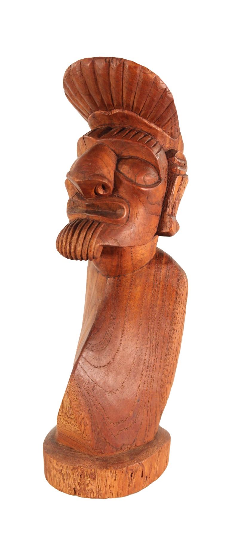 (1960s) Hand carved wooden Tiki with overhanging headdress and full beard. Stands on a solid wood base. 11.25"x3.25"x4.5". VG+ with minor wear.