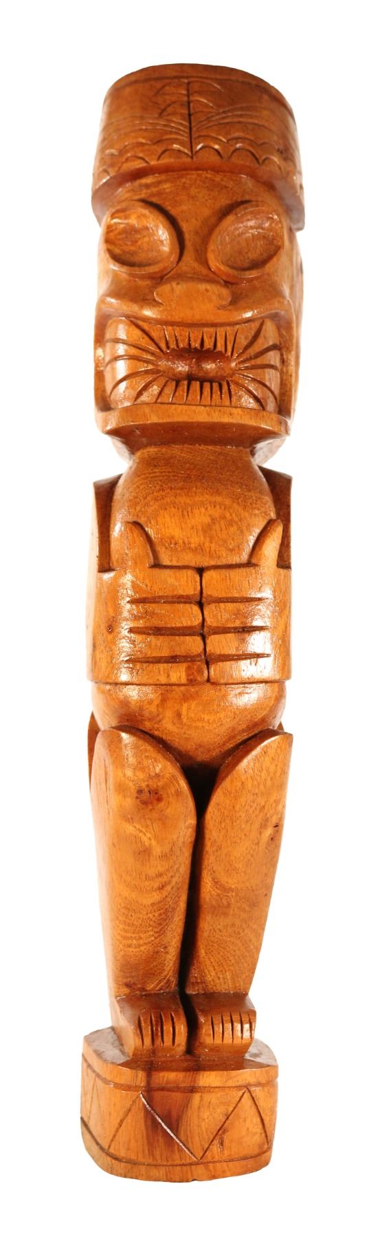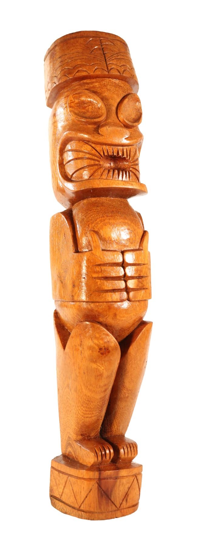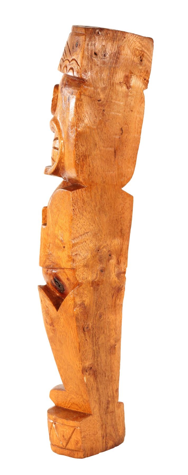 (1960s) Very rare door pull from the mythic Ren Clark Polynesian Village restaurant in Fort Worth, Texas. Wood carved Tiki figure features an intricately carved head piece with fascinating starburst, jagged teeth. This is essentially the mascot/signature logo Tiki from the venue. Solid wood. 18"x3.5"x4". VG holes on back of item from use.