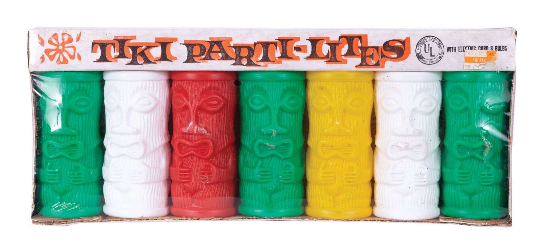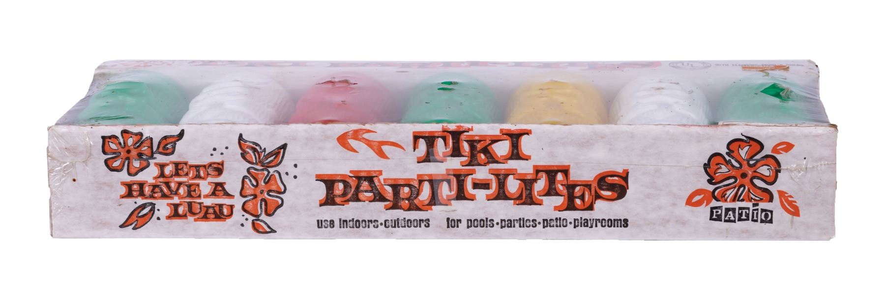 (1960s) A rare, unopened set of TIKI PARTI-LITES, the staple of any backyard luau or home Tiki bar! The set is still sealed in its original shrink wrap and has untouched, bold graphics on its box packaging. The molds for these were unceremoniously lifted off the famed Paul-Marshall Tiki mug! 19"x7.25"x3". EX.