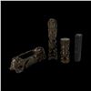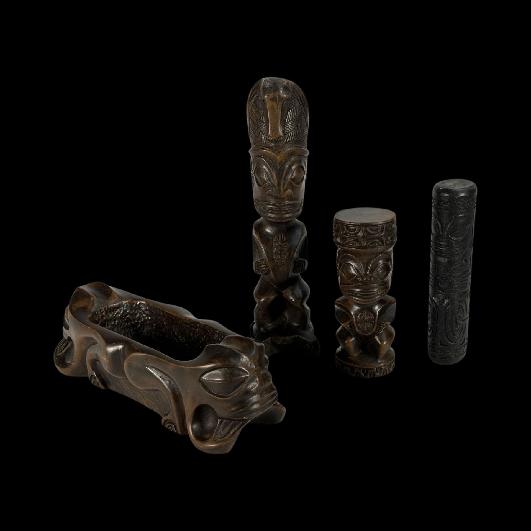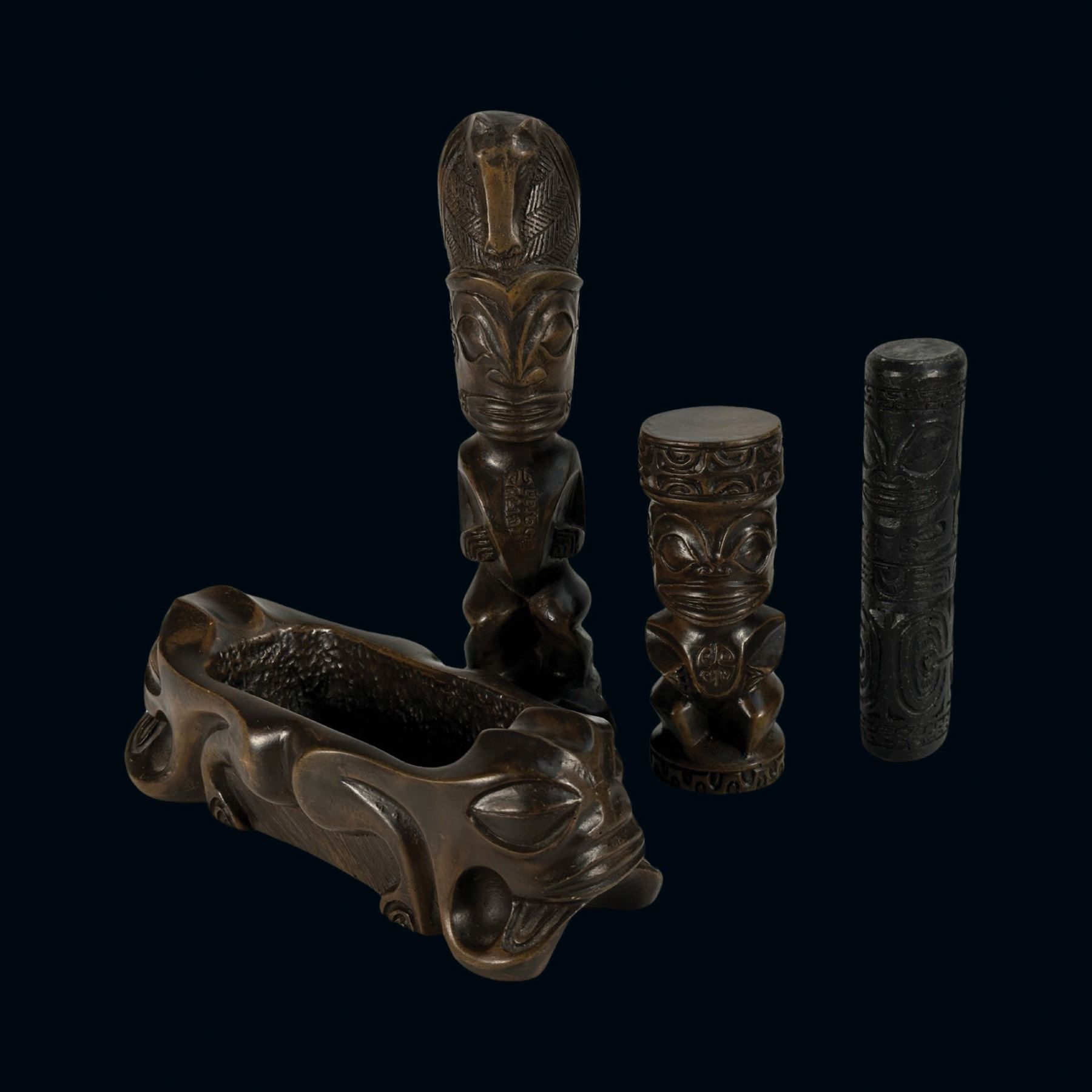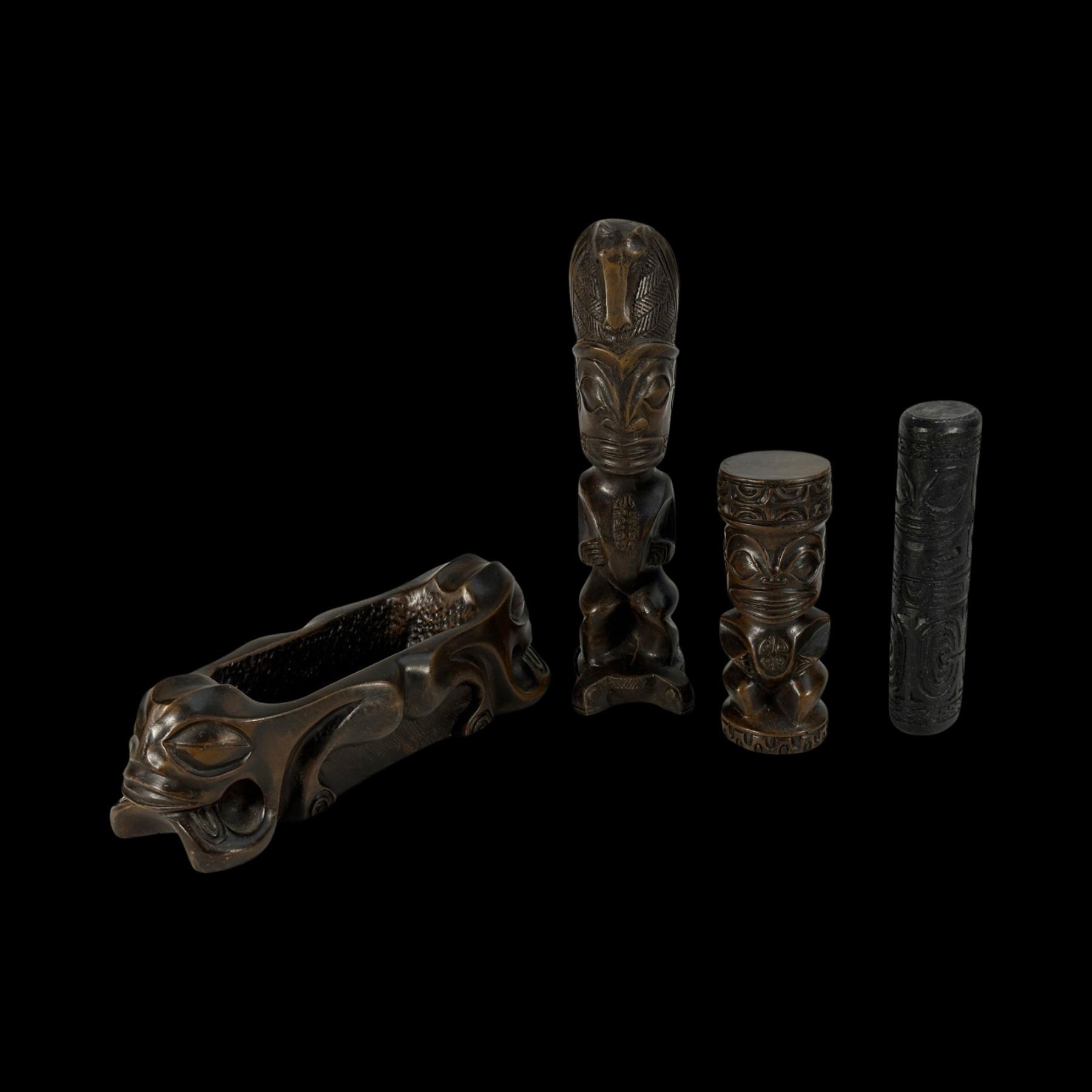 (1960s) A gorgeous set of intricately carved Marquesan design figures executed in what almost feels like ironwood, however is a solid resign with an aged patina. VG+. 2"dia x 5.25".