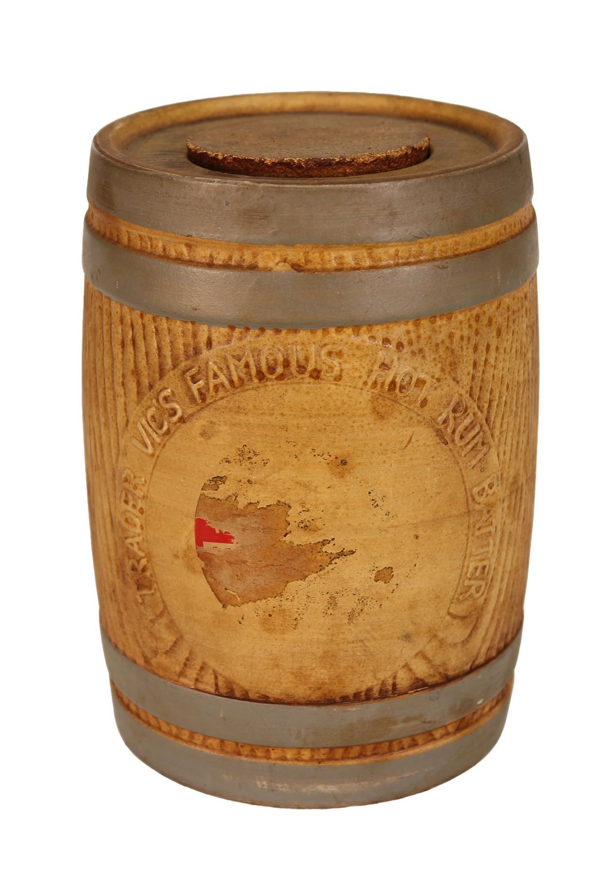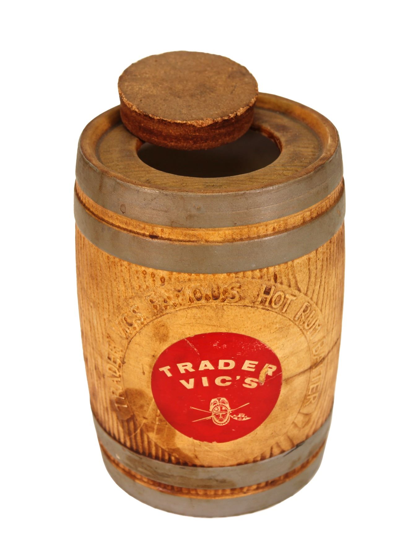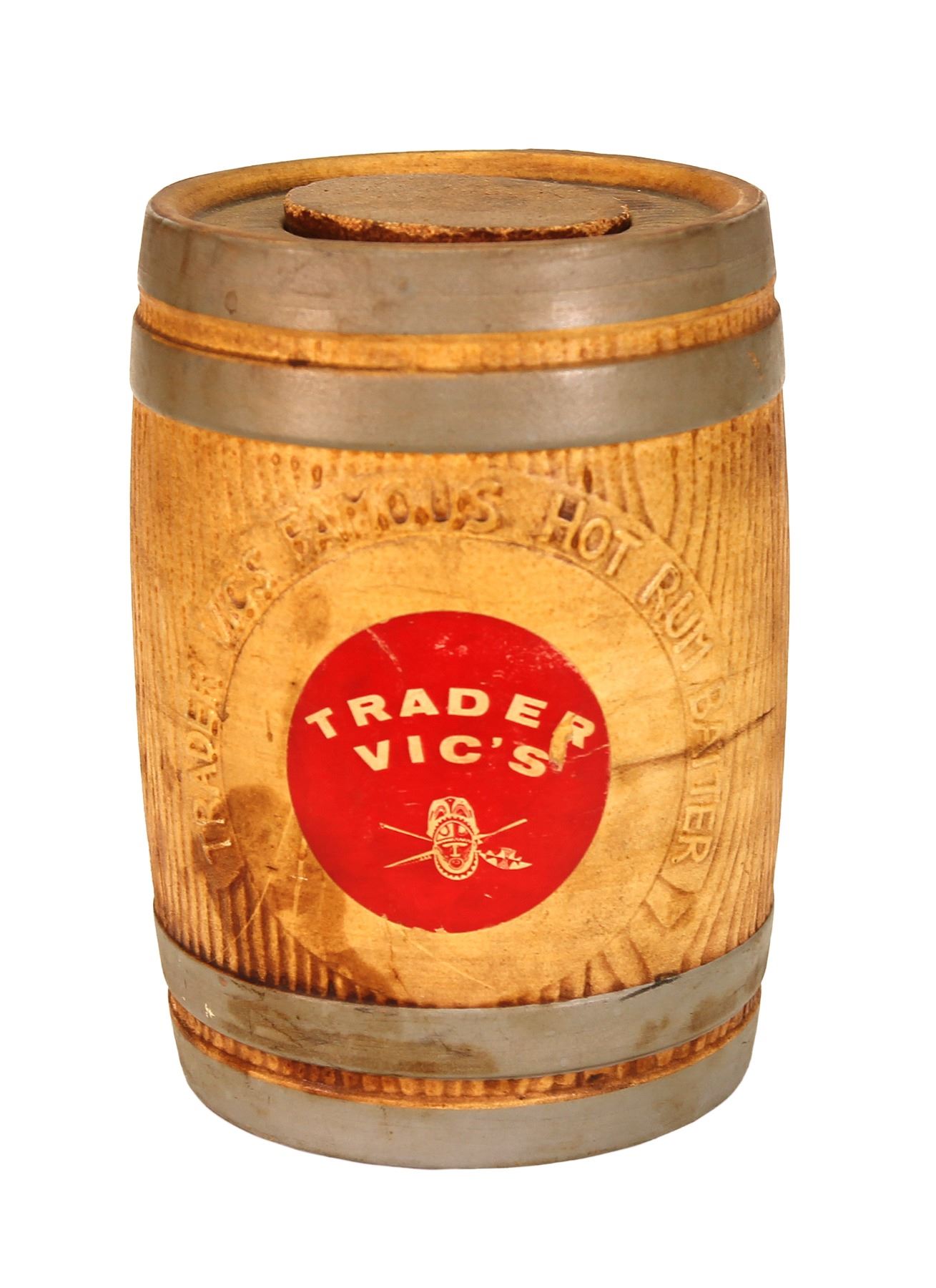 (1960s) Delightful memorabilia from the famous "Trader Vic's" restaurant. This item features the Trader Vic's logo on a Rum Buttered Rum barrel with embossed inscription and original cork stopper. Ceramic barrel with paper label. 8"x5.25". VG+.