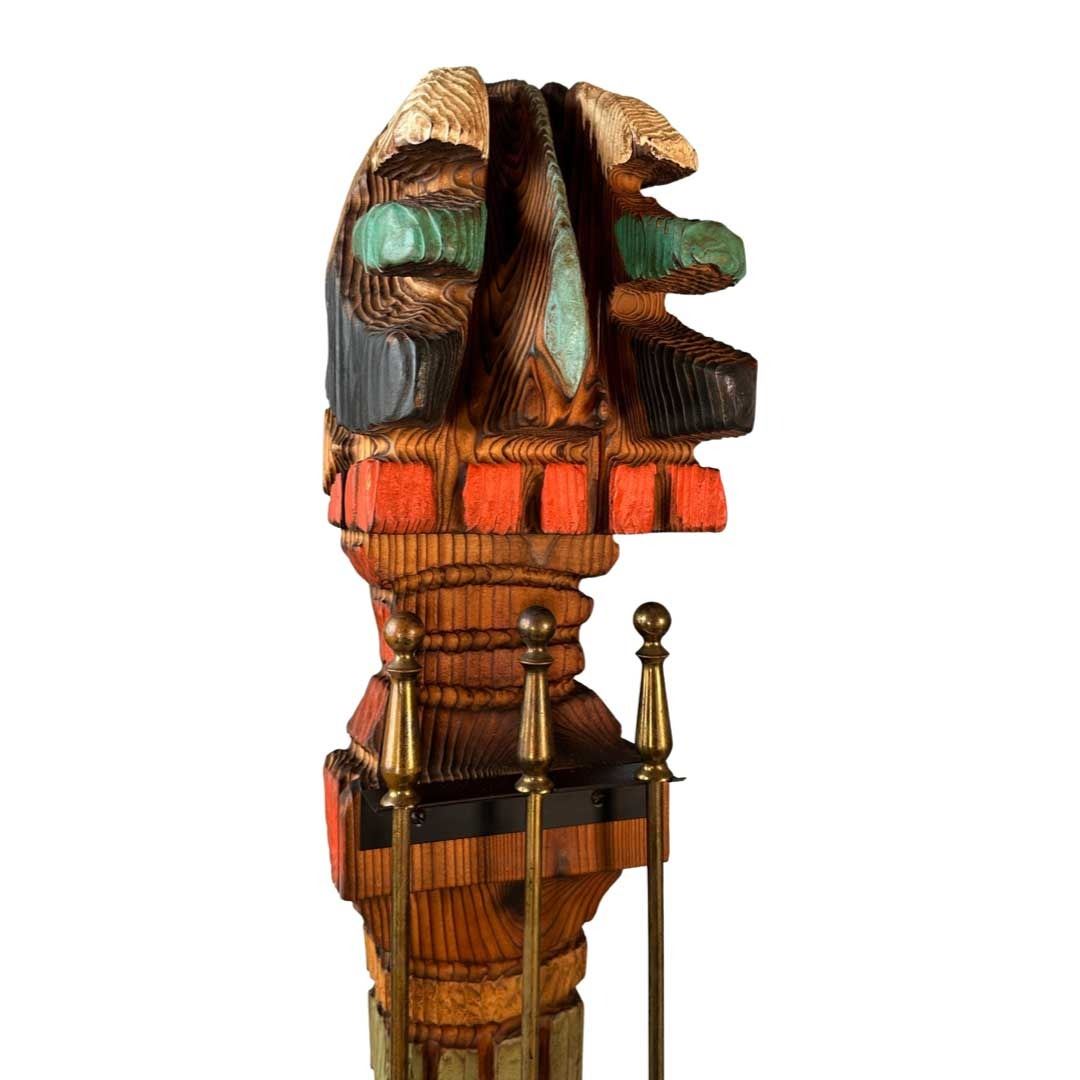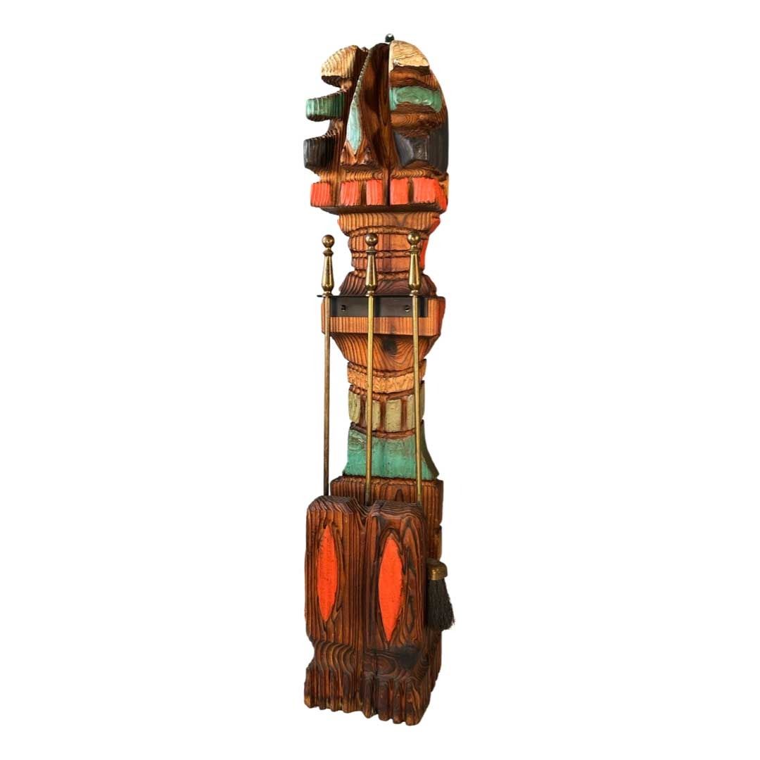 (1960s) A very rare fireplace Tiki tool set by WITCO! The design is beyond Primitive Moderne with stylized Tiki carvings and signature aqua, orange and cream coloring accents. Complete with fire tools. 7.5"x42.5". VG+ with typical wear.