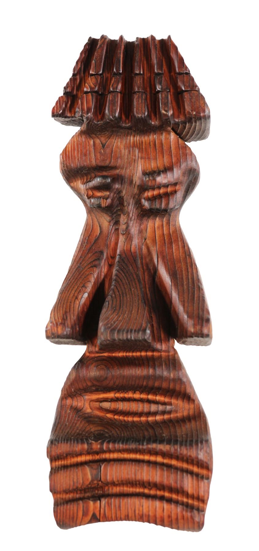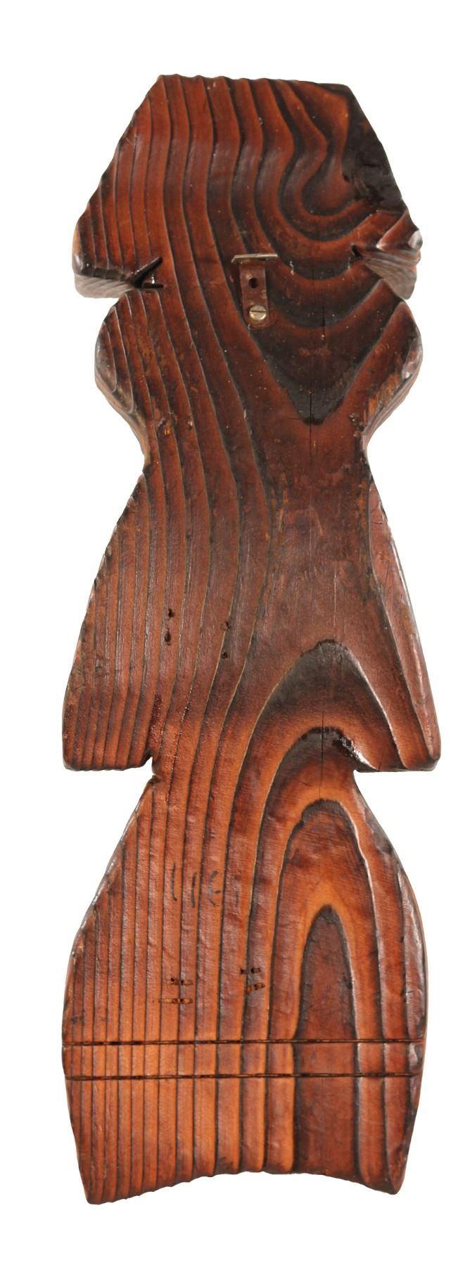 (1950s) An inventive, creative take on the Tiki mask. This hand carved item evokes a modernistic approach to the standard Tiki, featuring typical design craziness by master designer/carver, William Westenhaver. Solid wood. 17.5"x6". VG+