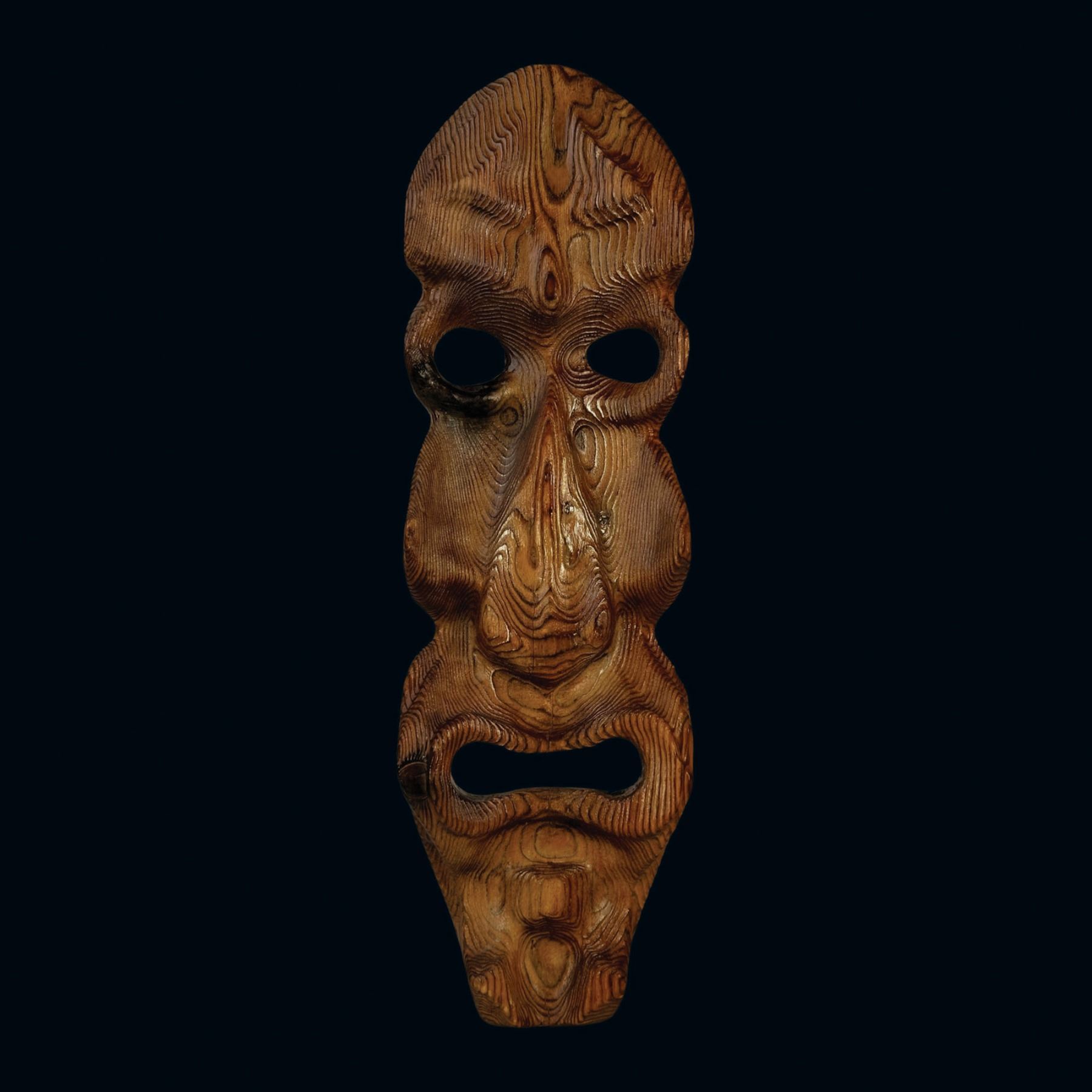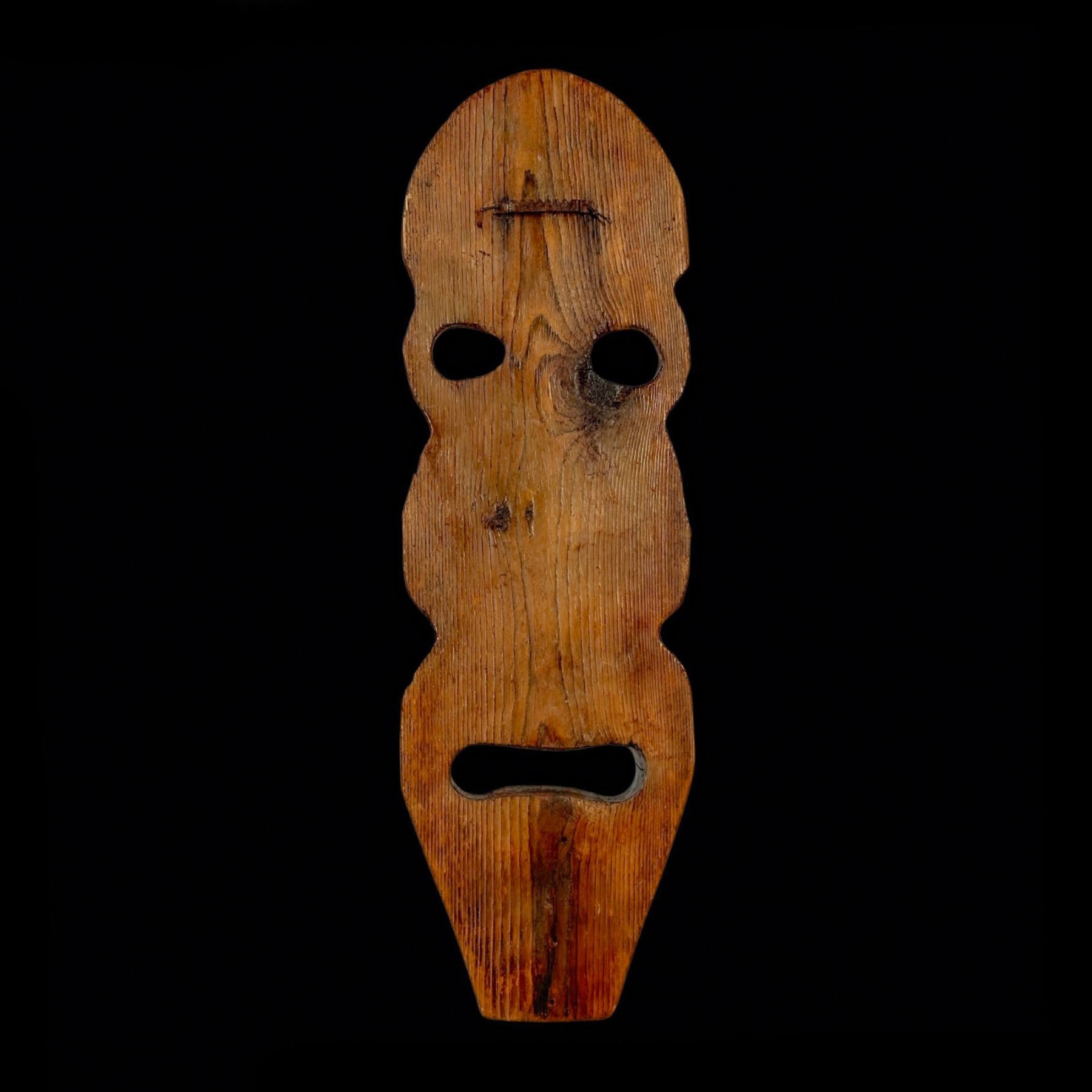 (1960s) Gale Haner was a prolific carver in Tacoma, Washington and a contemporary of William Westenhaver. The availability of the famous cedar wood in the area gives Haner work a close similarity to Witco, This Tiki mask is typical of his mask carvings. VG+. 7.75"x24.5".